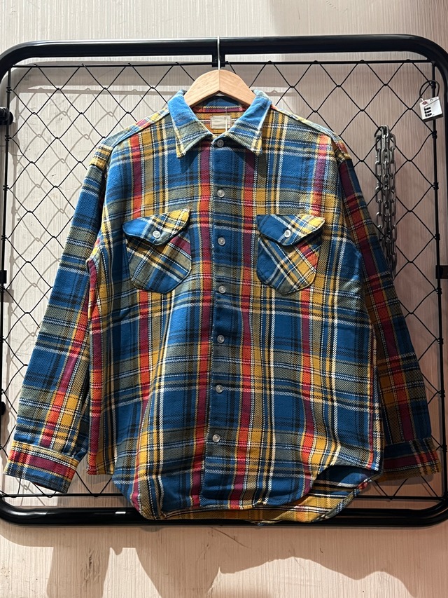 【アイテム説明】 60s OshKosh Flannel Shirt 1960年代頃の OshKosh フランネルシャツ。 ブルーベースにイエローとホワイトのラインが入る、ヴィンテージらしい雰囲気のチェックパターン。 ワークブランドらしいタフな生地感と、長年着込まれた柔らかな風合いが魅力の一着です。 フロントはフラップ付きのダブルポケット仕様。 デニムやワークパンツ、ミリタリーパンツとの相性も良く、アメカジ・ヴィンテージスタイルに取り入れやすいネルシャツです。 やや着用感はありますが、大きなダメージはなくヴィンテージ古着として良好なコンディション。 一枚での着用はもちろん、ジャケットやフリースのインナーとしても活躍します。 【サイズ】M 着丈-70 身巾-57 肩巾-46 袖丈-53 全て㎝にて計算 ※多少の差異はご了承ください。 【管理番号】 ST260111503 ⚠️ご購入前にご確認ください⚠️ 当店の商品は古着、ビンテージアイテムを取り扱っております。 使用感や色褪せ、細かなダメージ等がある場合がございます。 可能な限り画像と説明文で状態をお伝えしておりますが、古着にご理解のある方のみご購入をお願いいたします。 ・※当店では、オンラインショップ掲載商品を実店舗でも同時に販売しております。 そのため、同一タイミングでご注文があった場合は、店頭販売を優先させていただく場合がございます。あらかじめご了承のうえ、ご注文くださいますようお願いいたします。 ・サイズは実寸を記載しておりますので、お手持ちの洋服と比較の上ご検討ください。 ・お客様がお使いのモニター環境により、実物と色味が異なる場合があります。 ・古着特有の匂いが残っている場合があります。 ・返品、交換は原則としてお受けしておりません。ご不明点はお気軽にご購入前にお問い合わせください。 ⚠️ Please Read Before Purchasing ⚠️ Please Note: Items listed on our online store are also available for purchase in our physical store. In the event that an item is ordered both online and in-store at the same time, priority will be given to the in-store purchase. We appreciate your understanding and kindly ask for your cooperation. All items are vintage or second-hand clothing. There may be signs of wear, fading, or minor damage due to age. We do our best to describe the condition and provide accurate photos, but please purchase only if you are comfortable with vintage items. Sizes are measured by hand. Please compare with your own clothes before purchasing. We do not accept returns or exchanges unless there is a significant issue. Feel free to message us with any questions before purchasing.