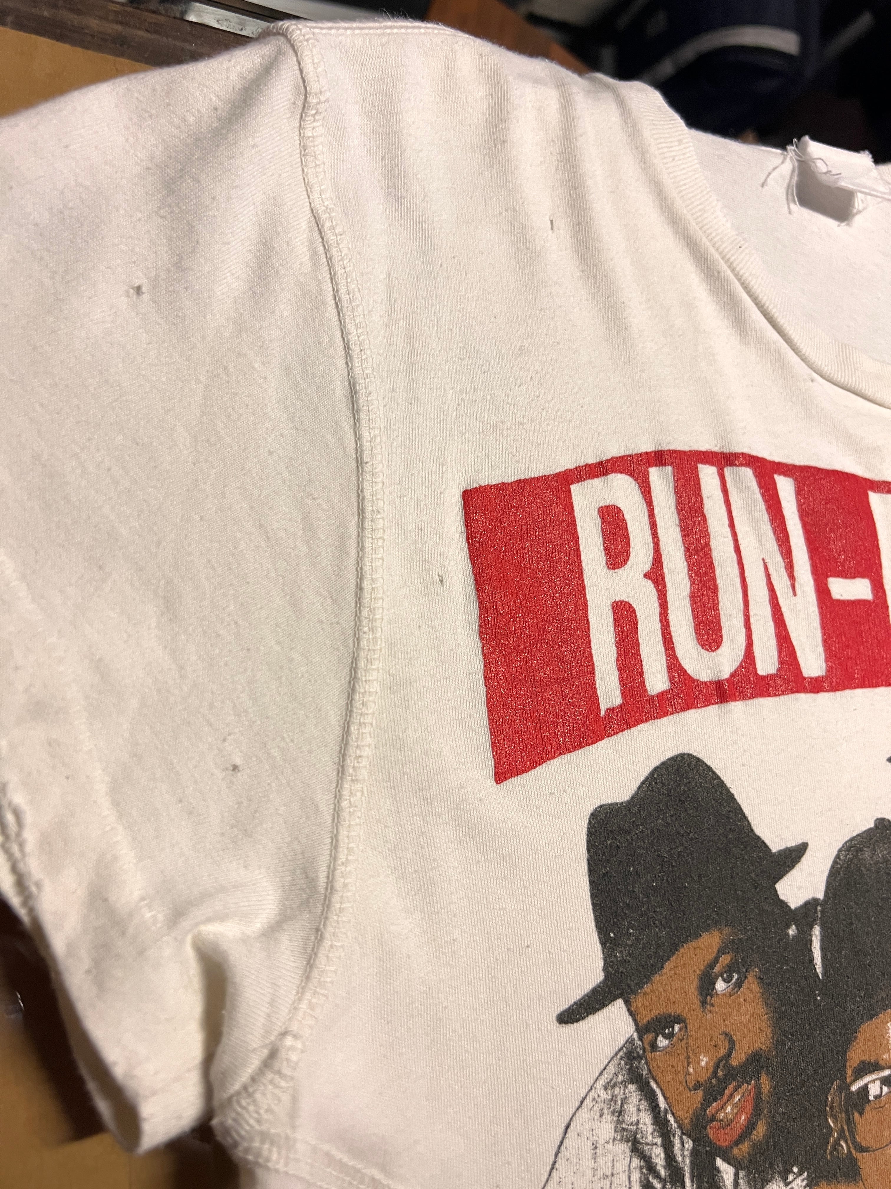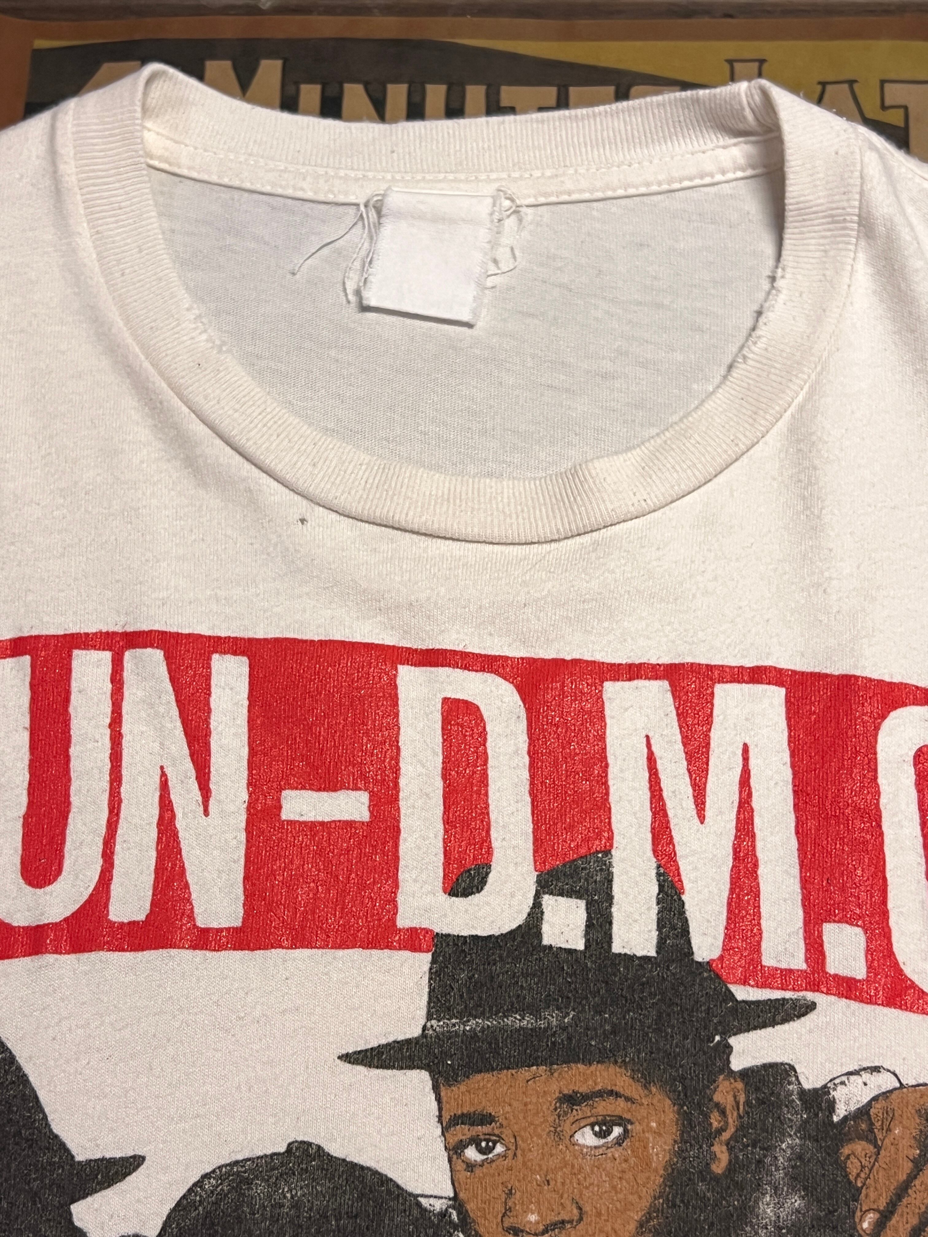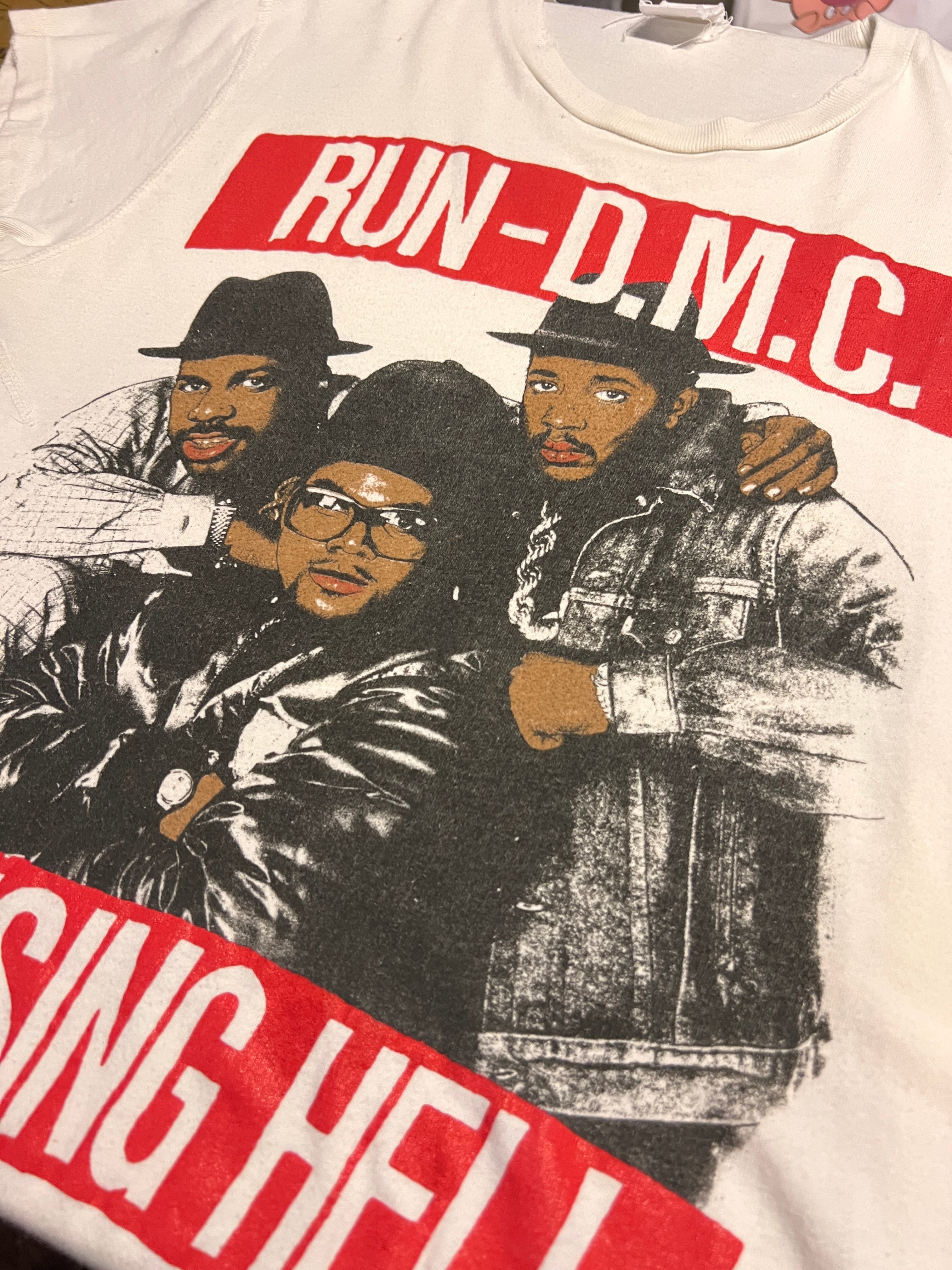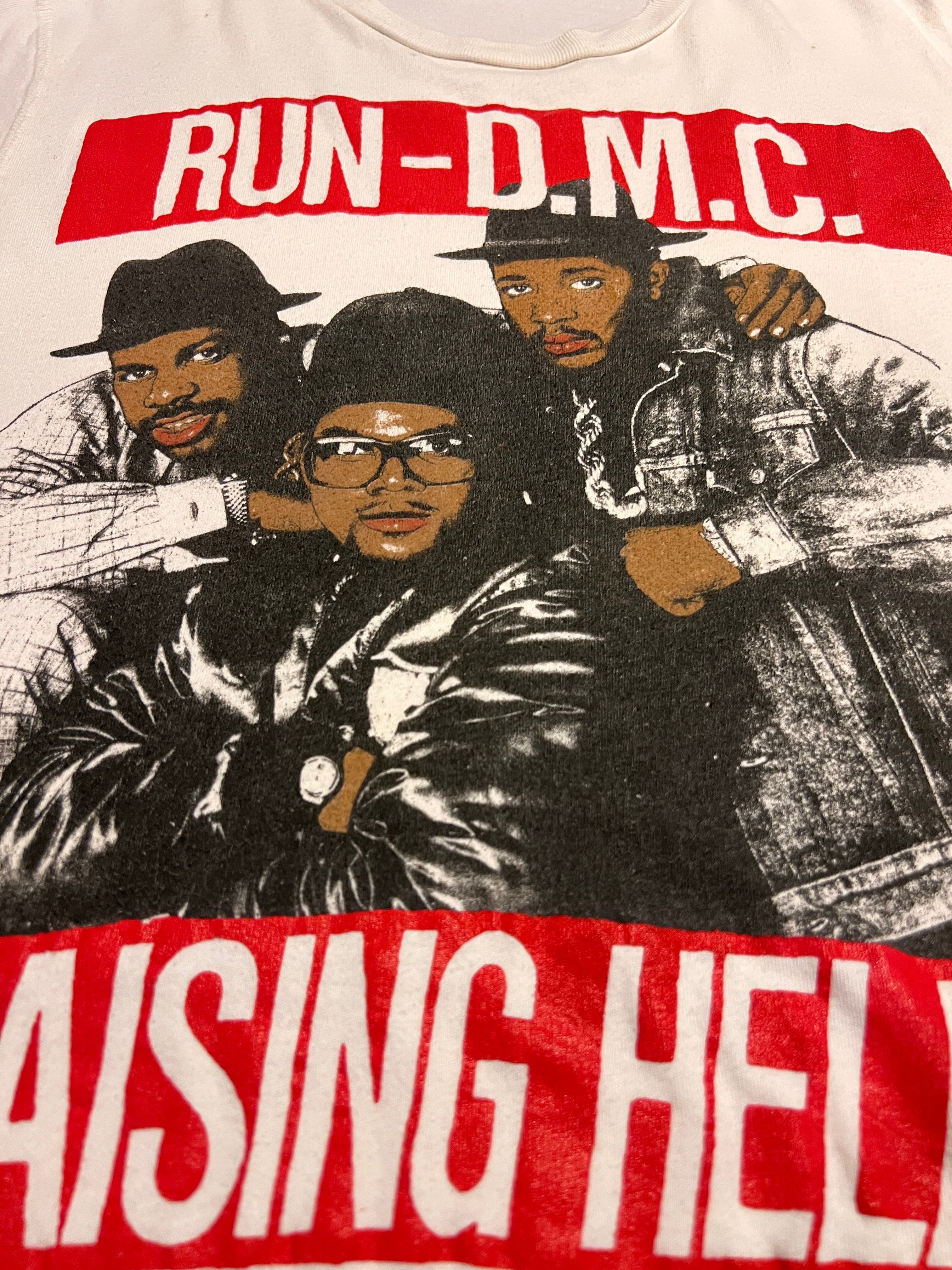 ヒップホップ黎明期を象徴するグループ、RUN-D.M.C.の3rdアルバム『RAISING HELL』(1986年)のグラフィックを大胆にフロントへ配したヴィンテージTシャツ。
