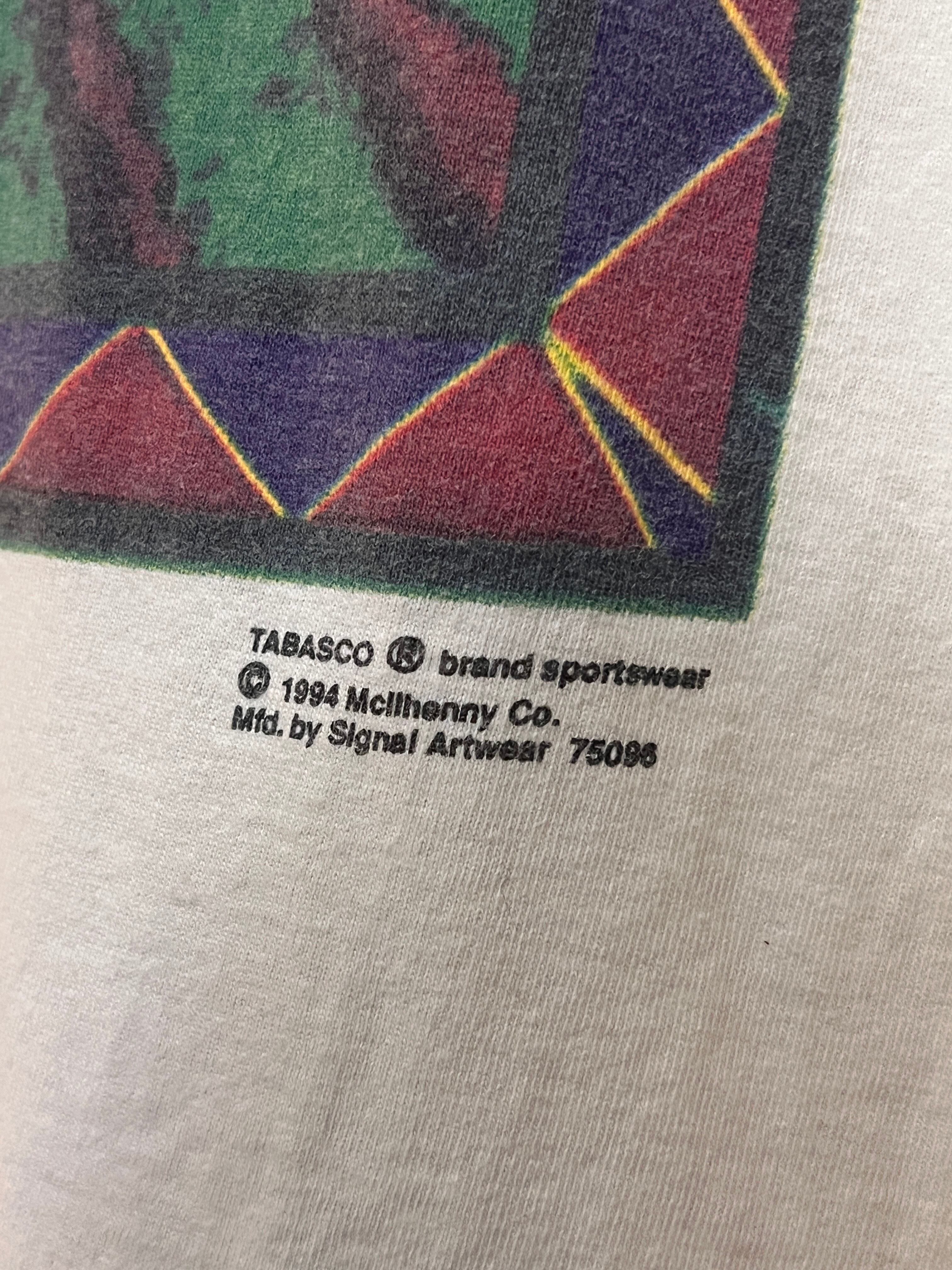 アメリカンホットソースの代名詞「TABASCO」が手掛けた1994年製のプリントTシャツ。Signal Artwearボディを使用した100%コットンのUSA製。フロントには「JALAPEÑO」のピリッと効いたロゴ、そしてバックには大胆なグラフィックとともに「BORN TO BE MILD」のキャッチーなコピーがデザインされた一枚。