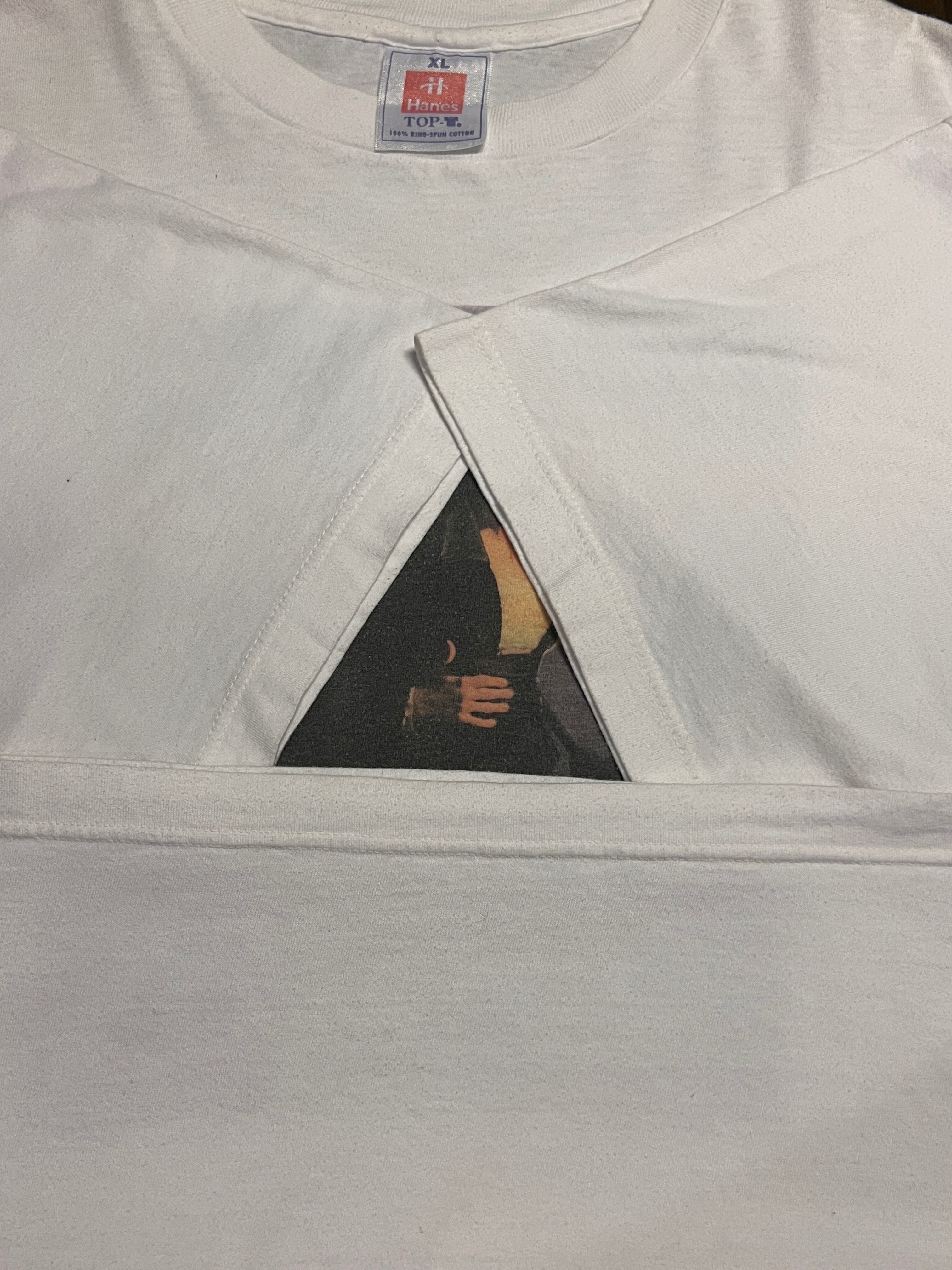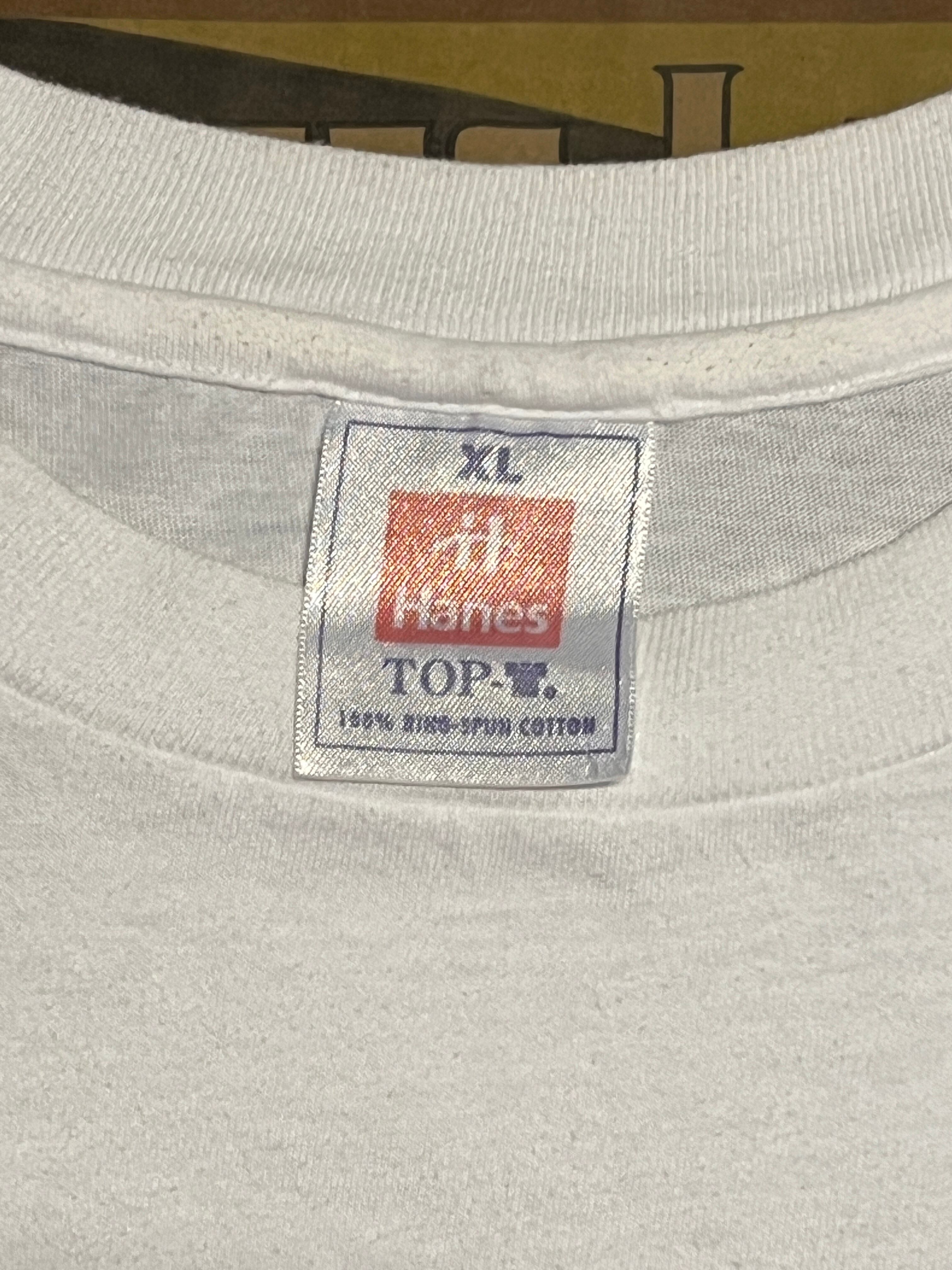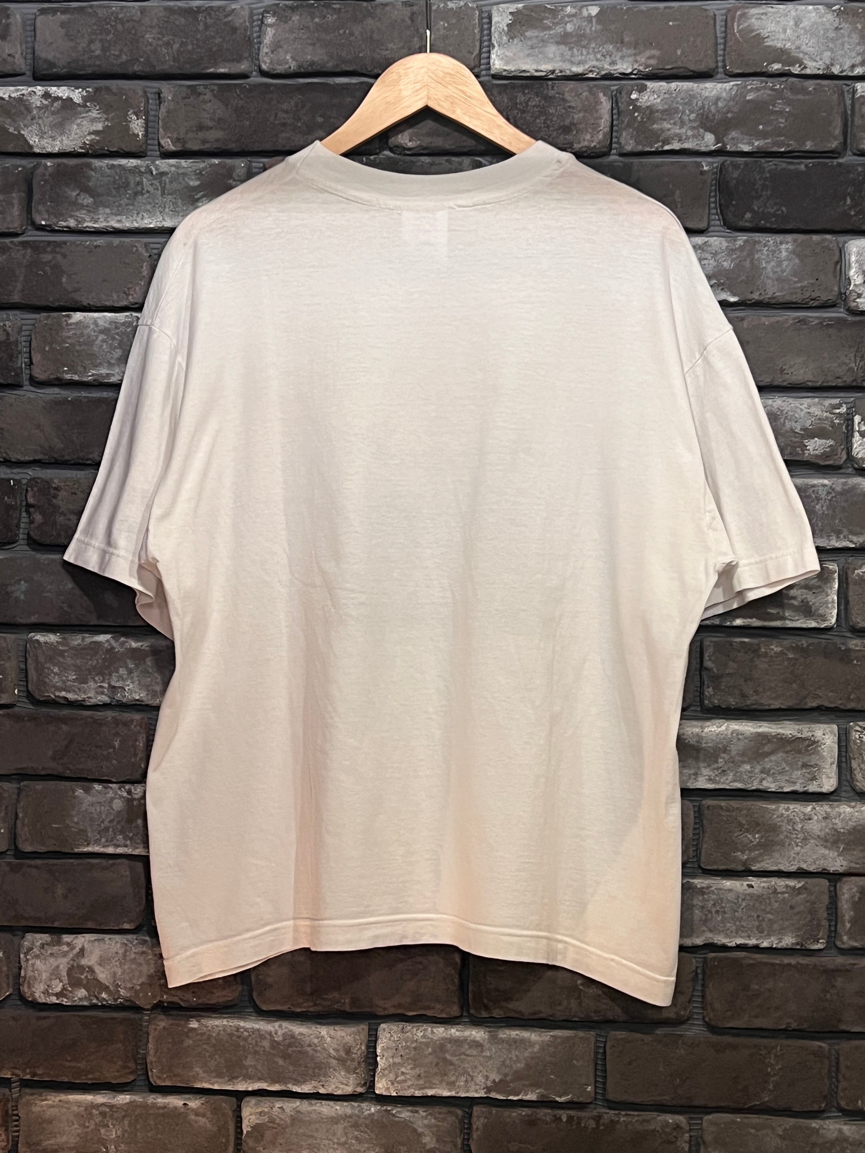 タグはHanes TOP-T、XLサイズ。100%コットンでしっかりとした生地感。着丈71cm・身幅68cmと、日本人がオーバーサイズで着用するのにちょうど良いゆったりとしたシルエットです。