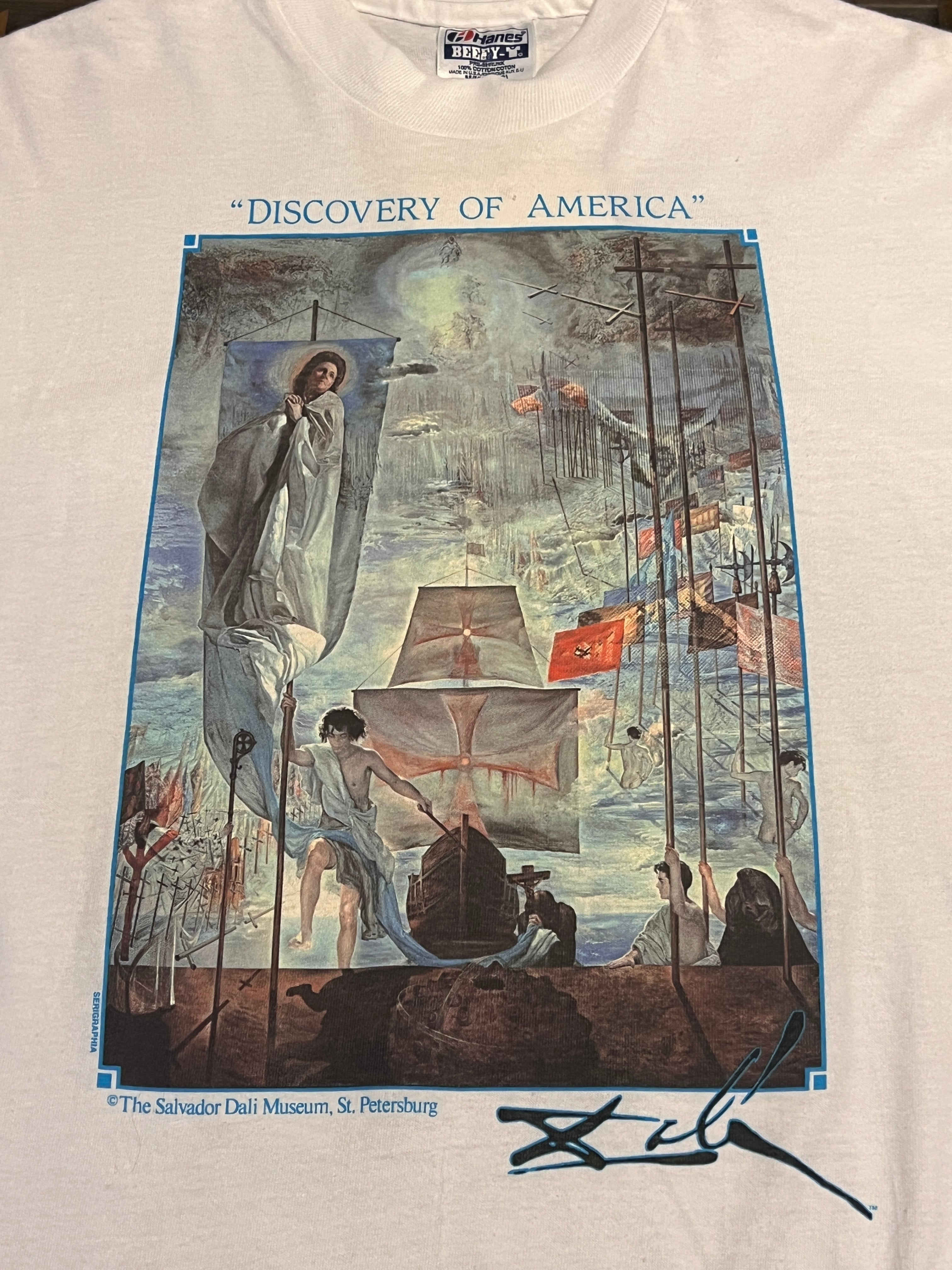 サルバドール・ダリが描いた「アメリカ大陸の発見(DISCOVERY OF AMERICA)」を大胆にフロントプリントした、90年代オフィシャルライセンスTシャツ。Hanes BEEFY-TのUSA製ボディを使用し、SERIGRAPHIA社による正規ライセンス商品です。