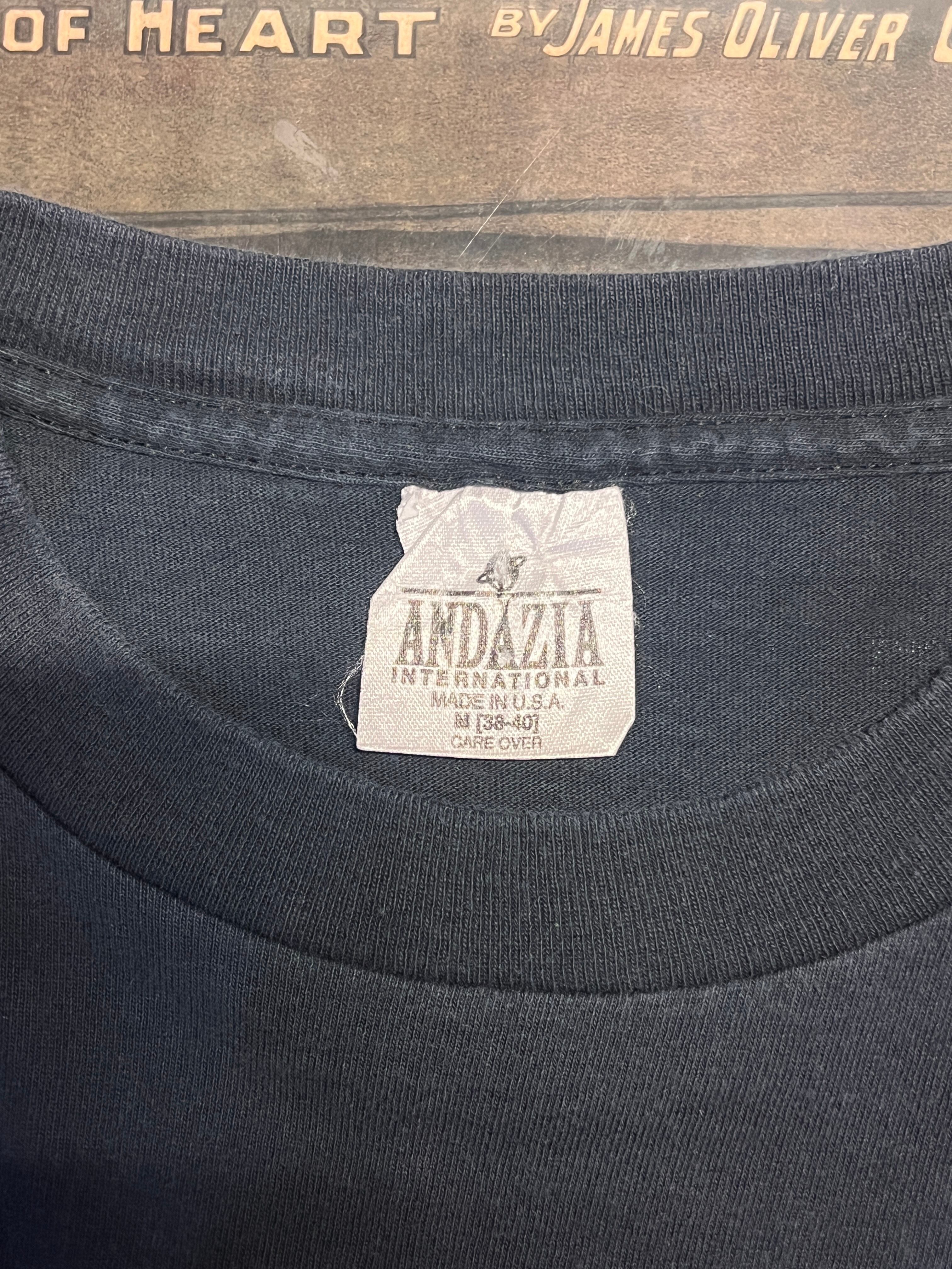 90年代アートTの中でもひときわ存在感を放つ、マウリッツ・エッシャーの名作「Drawing Hands(描く手)」を大胆に配したヴィンテージTシャツ。フロント左胸にはコンパクトに、バックには迫力のある大判プリントで施された珠玉のアートワーク。タグはUSA製を示す《ANDAZIA INTERNATIONAL》で、袖・裾ともにシングルステッチ仕様。