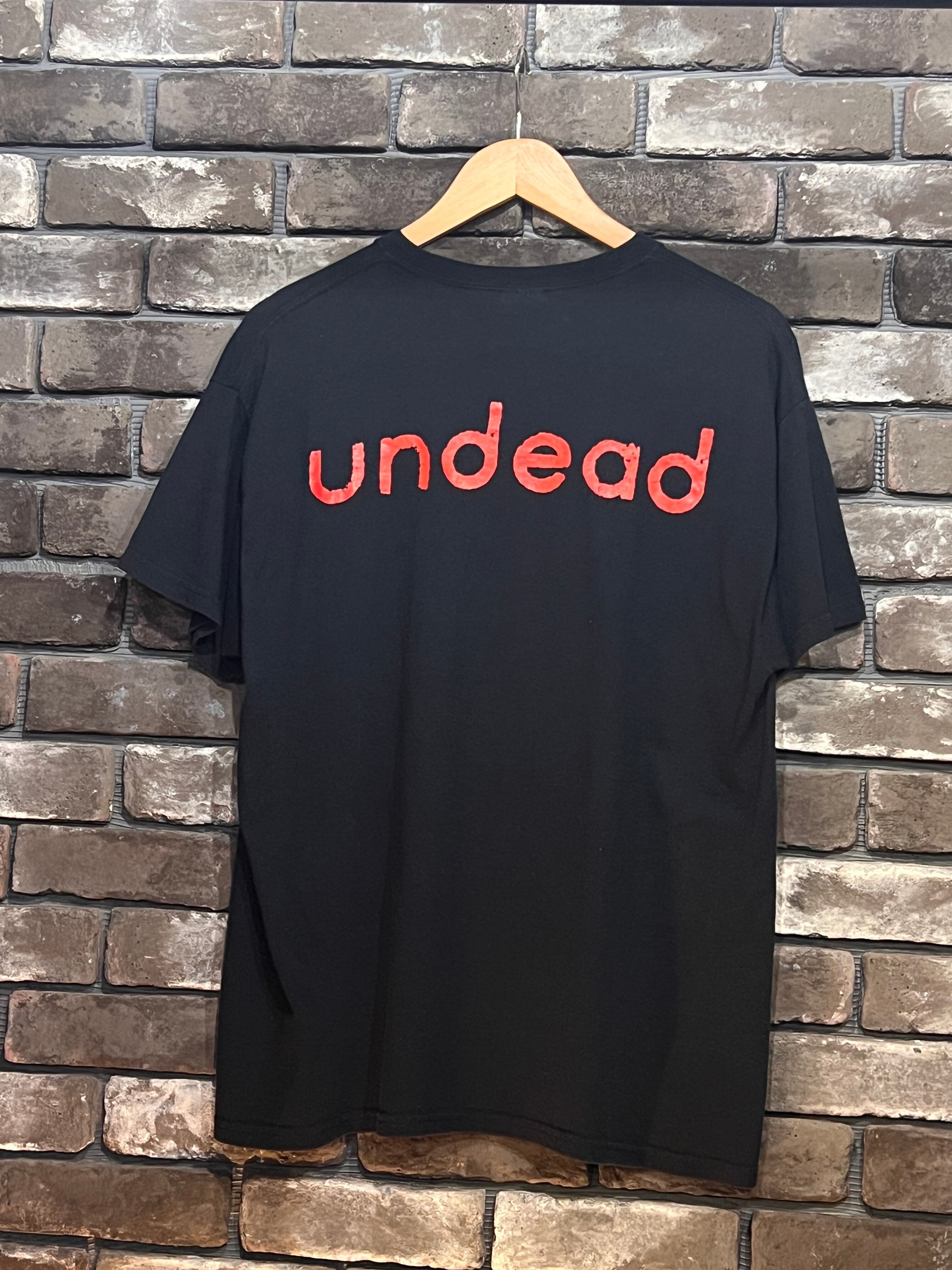 フロントには赤のコントラストが映える象徴的なグラフィックに「indecision」のタイポ、バックにはシンプルに「undead」の文字がプリントされたインパクトある一枚。