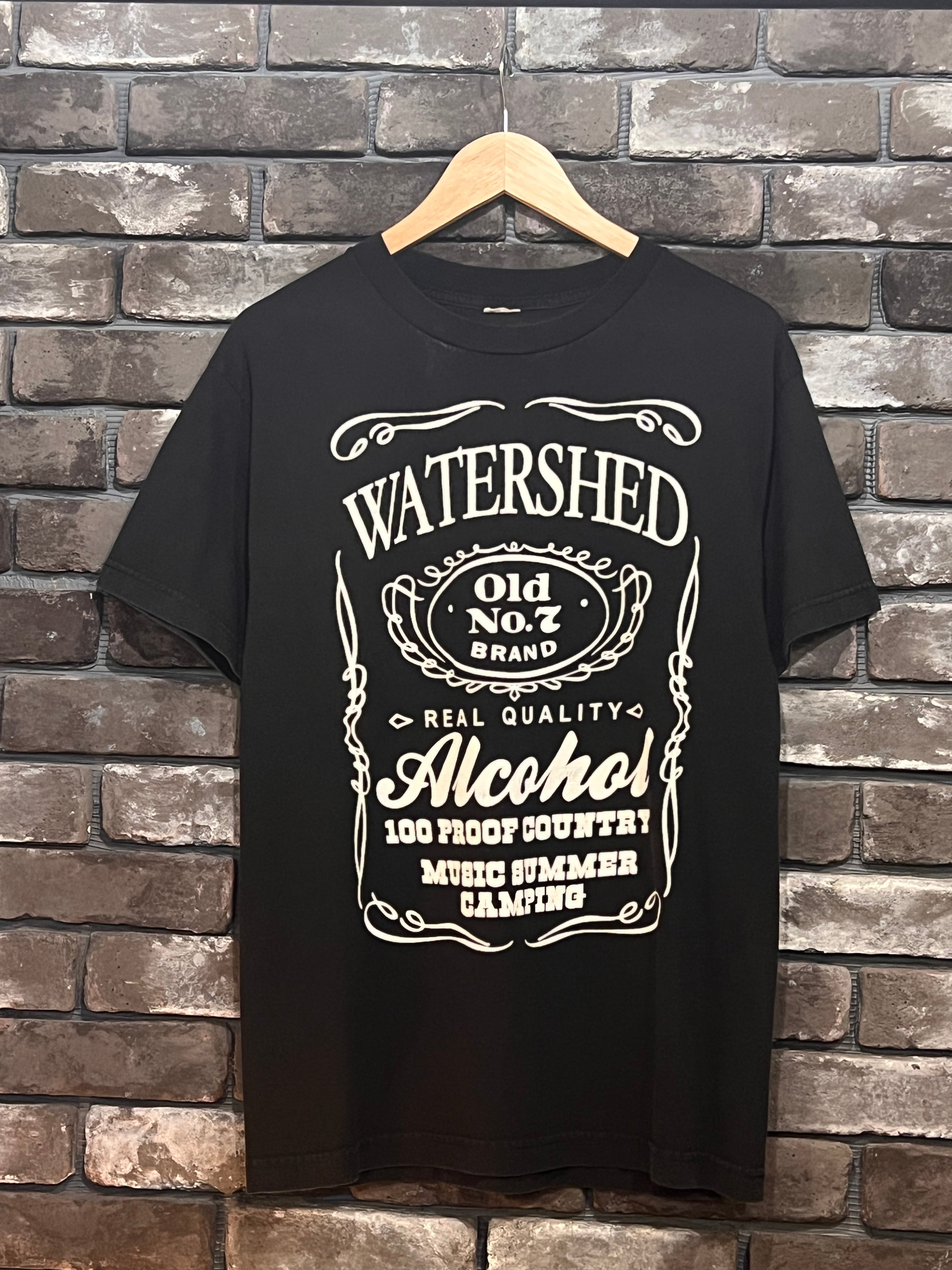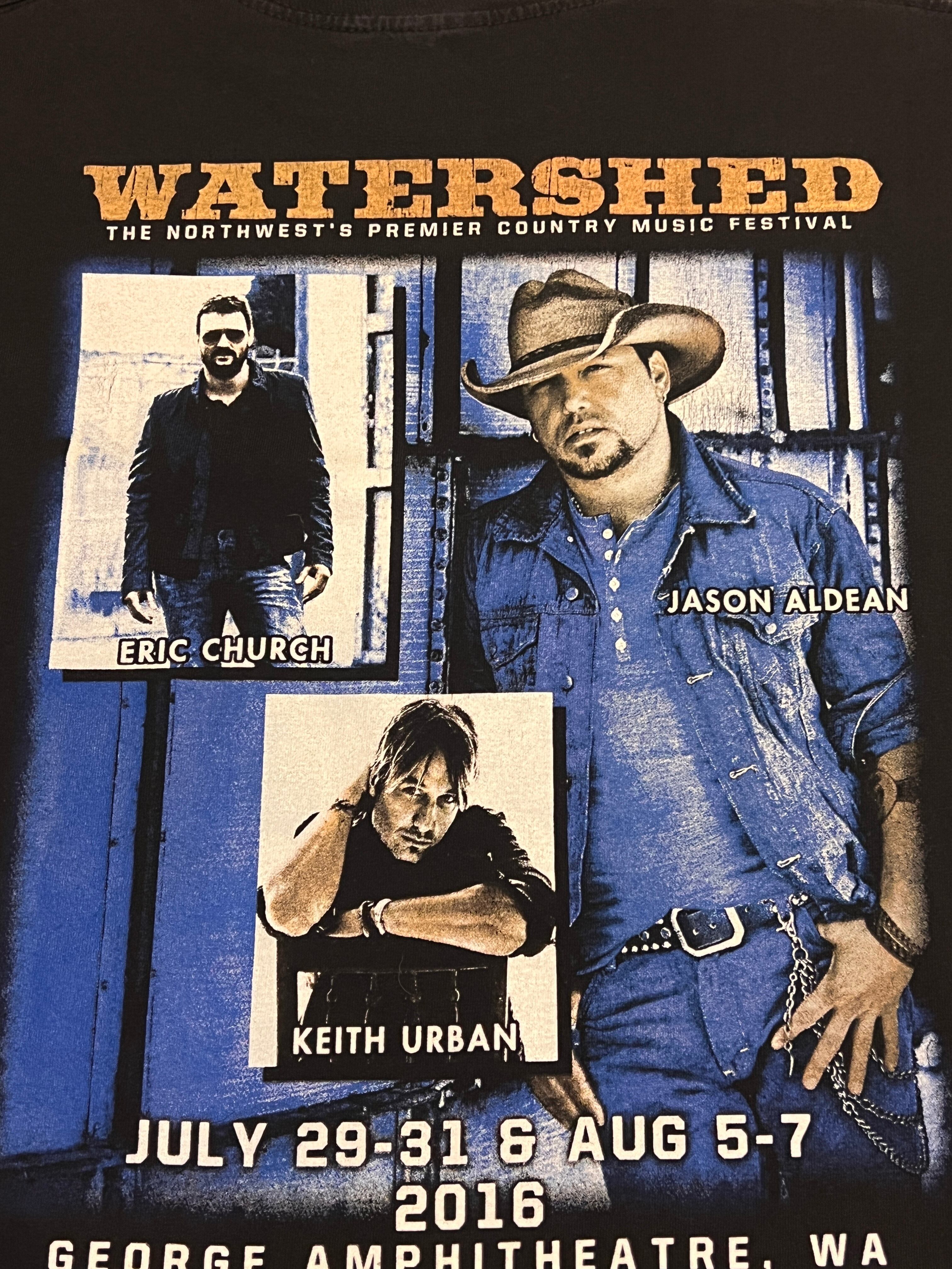 アメリカ・ワシントン州で開催されたカントリーミュージックフェス「WATERSHED 2016」のオフィシャルTシャツ。フロントはウイスキーボトル風のグラフィックがインパクト大、バックにはヘッドライナーのJason Aldean、Eric Church、Keith Urbanら人気アーティストのフォトプリント入り。