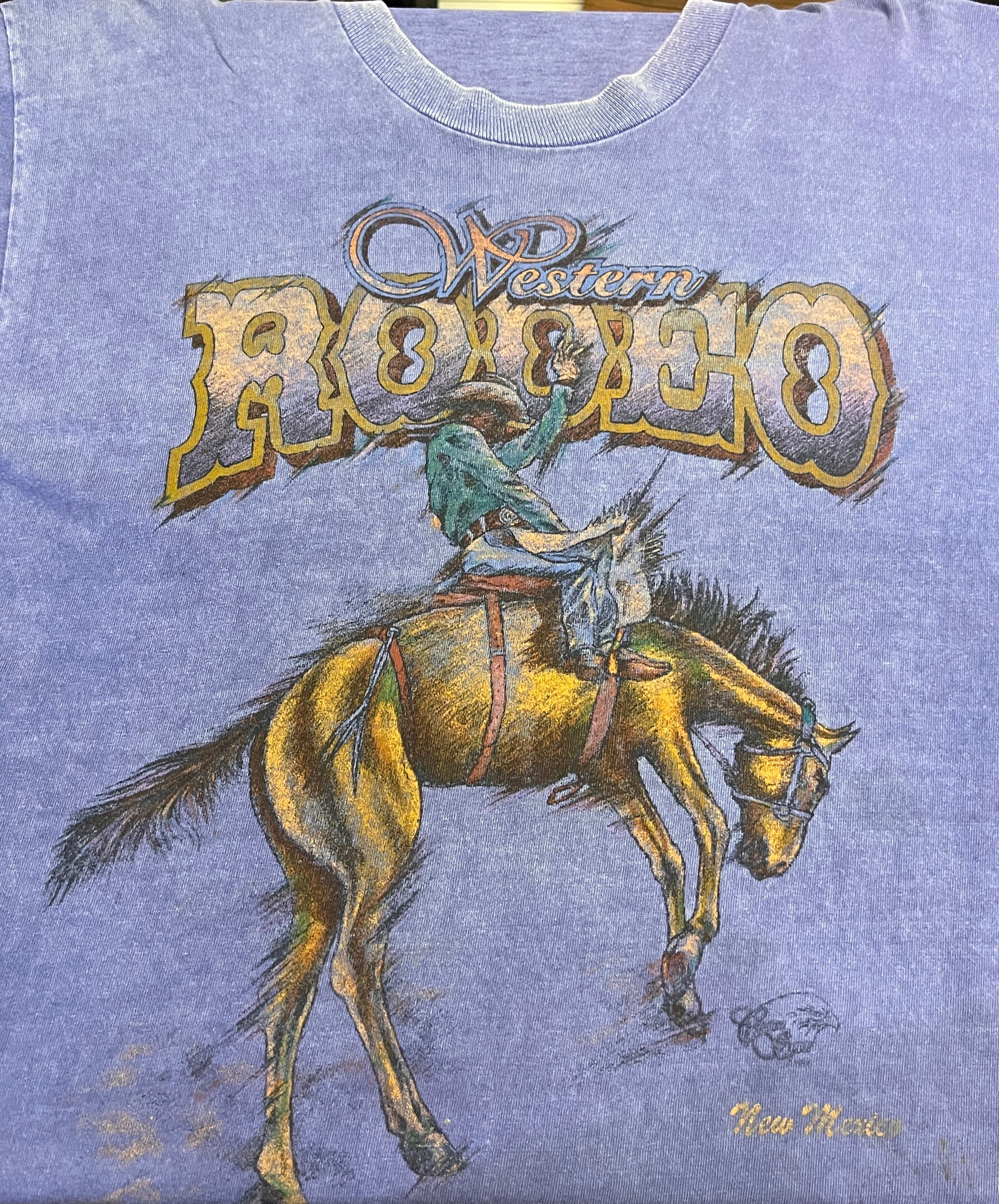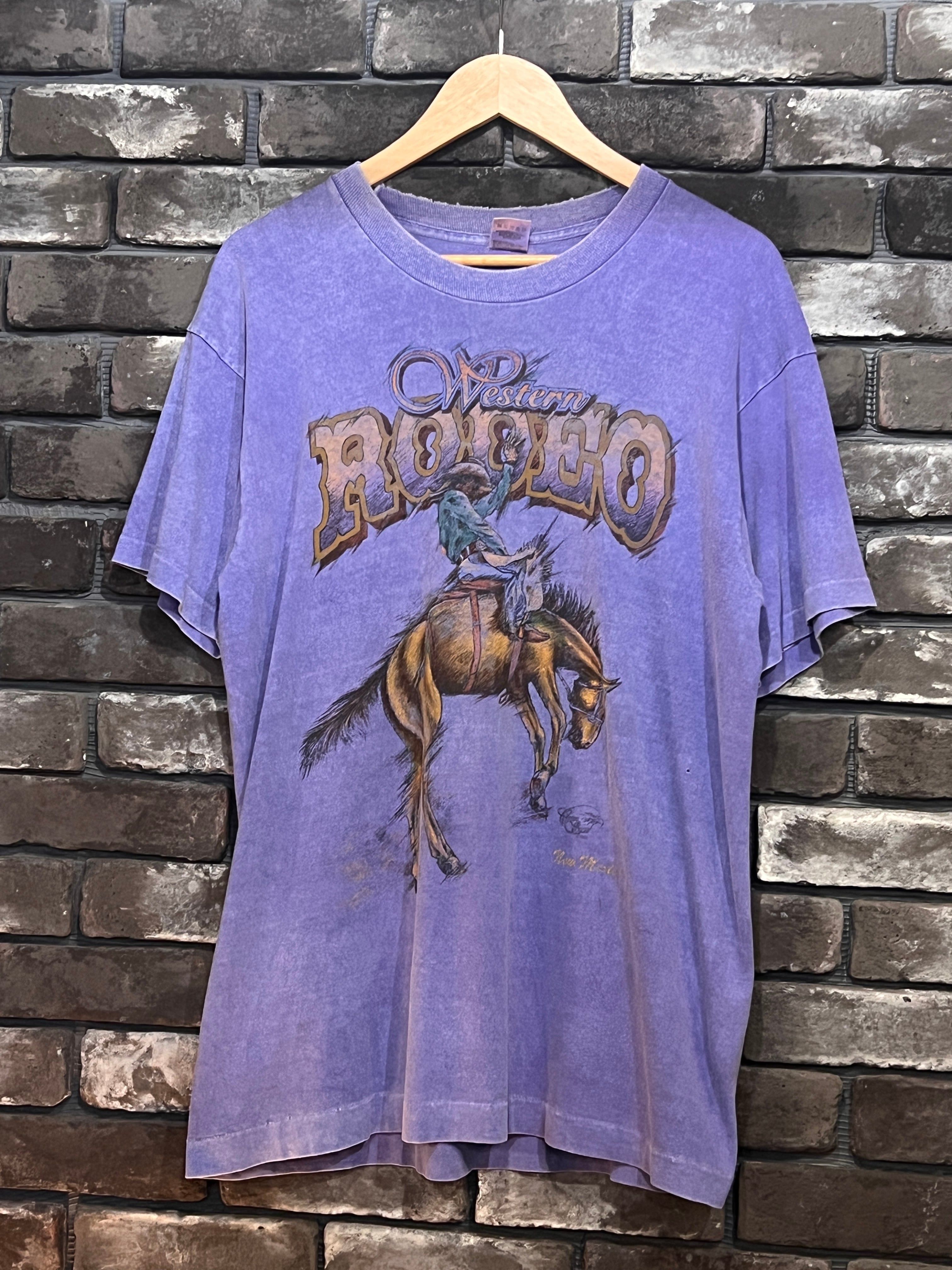馬上でロデオを繰り広げるカウボーイの迫力あるグラフィックが印象的なヴィンテージTシャツです。