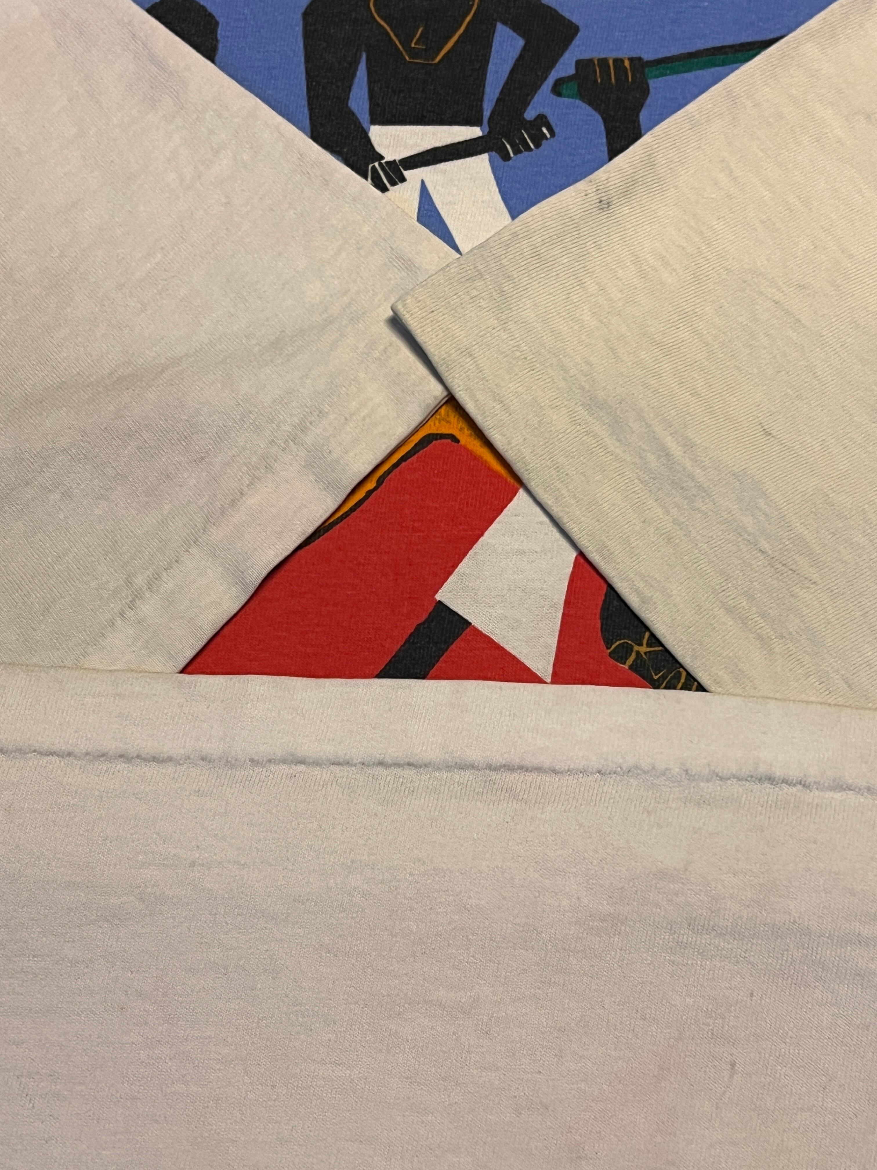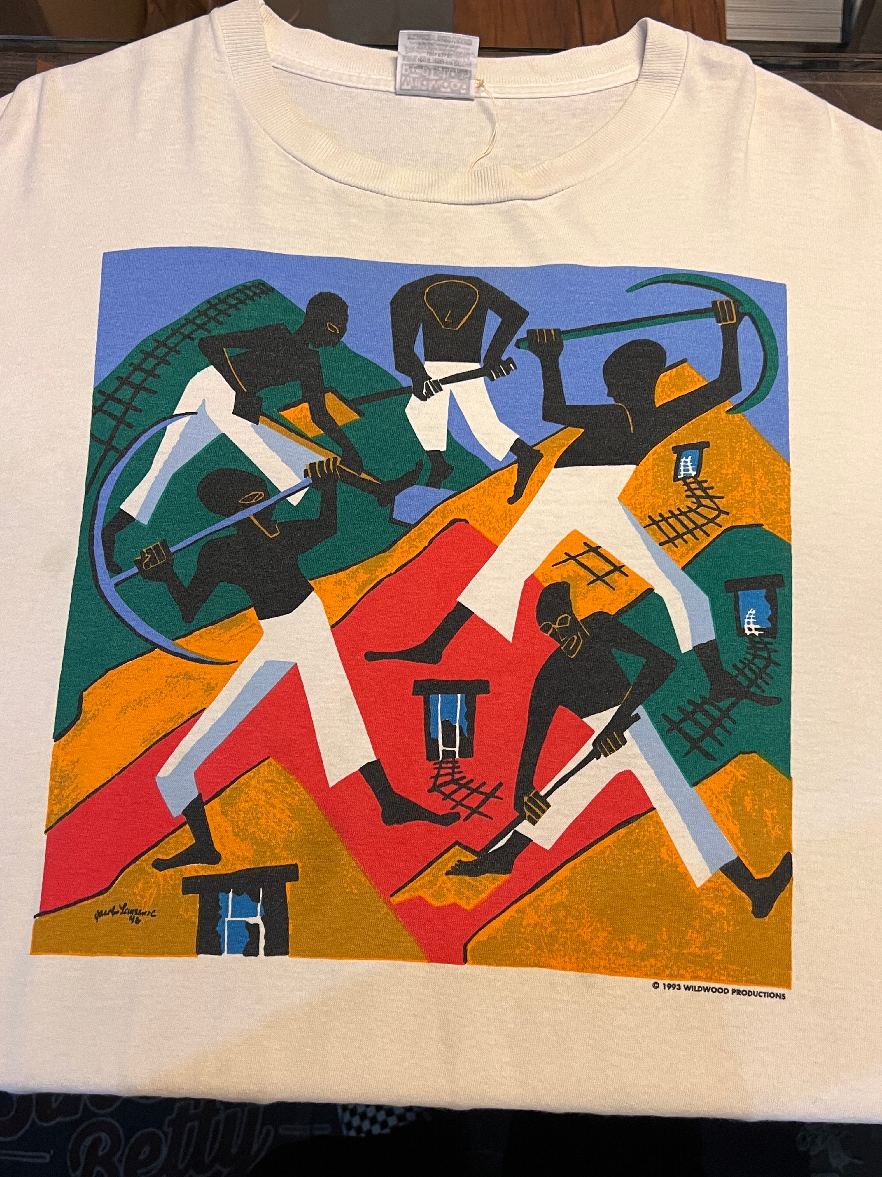 アメリカを代表するアフリカ系アメリカ人画家 Jacob Lawrence(ジェイコブ・ローレンス) の作品を大胆に落とし込んだ、1993年コピーライト入りのアートTシャツ。