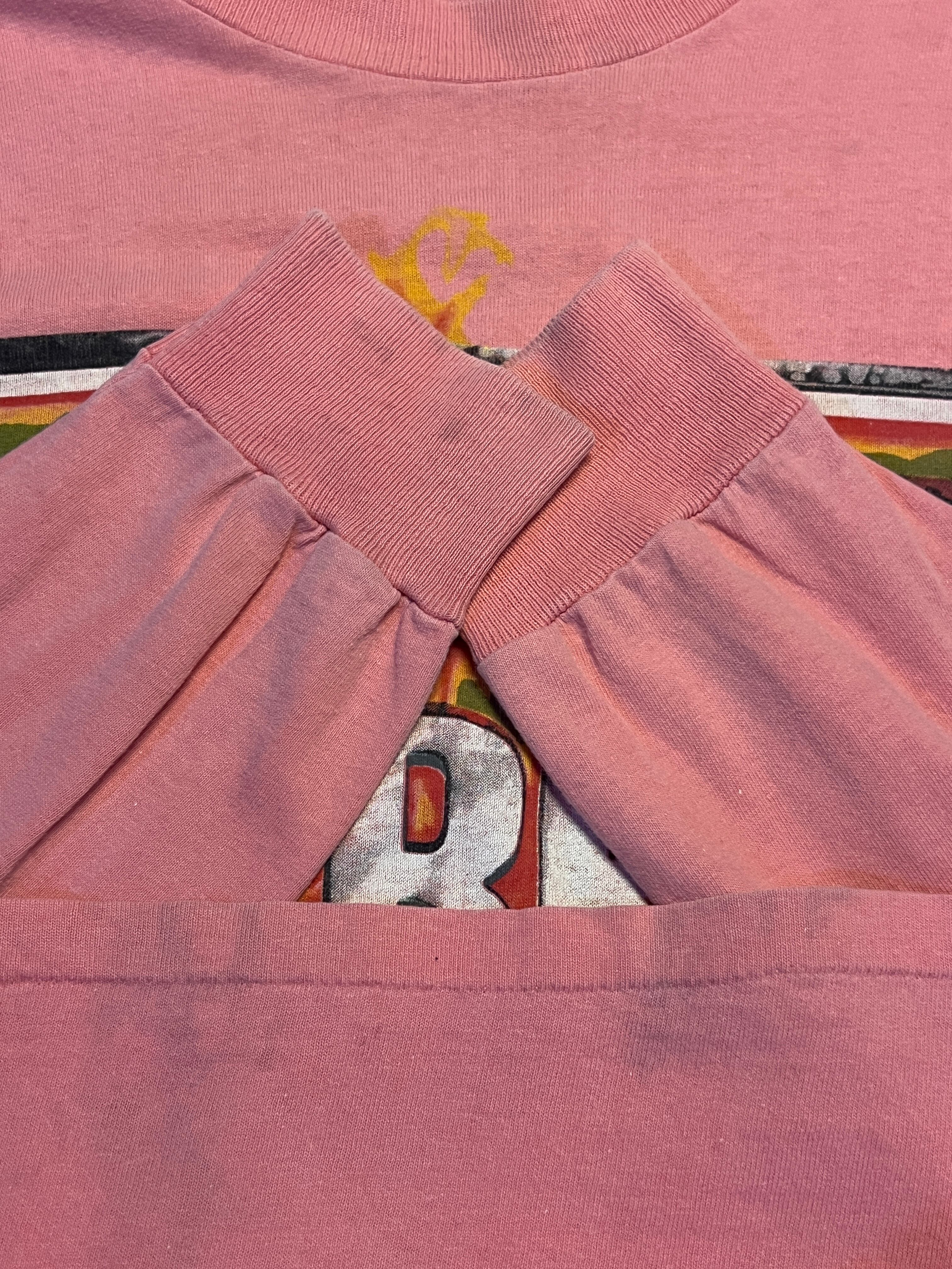 フロント・バックともに存在感抜群のロゴプリントが施され、さらに袖には「TEMPERED STEEL」のプリントが入ったスペシャル仕様。ボディカラーはややフェードがかったピンクで、炎を思わせるグラフィックとのコントラストが抜群。シングルステッチ仕様、1987年コピーライト入りで、正真正銘のオリジナル80sヴィンテージ。