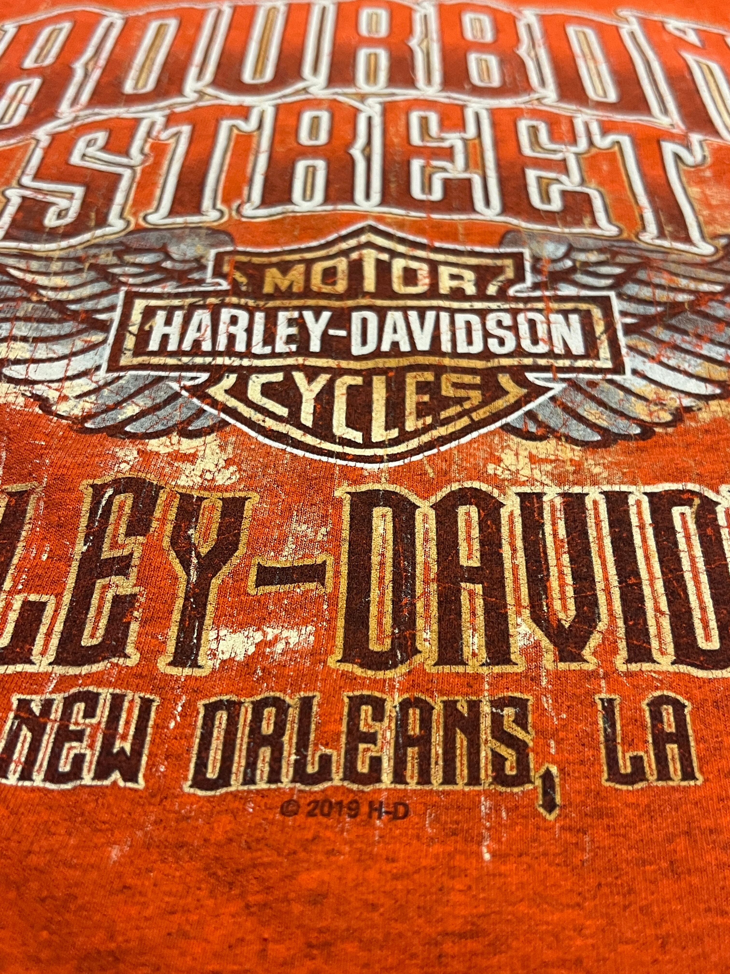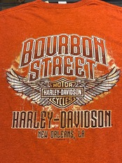 ニューオーリンズの代名詞「BOURBON STREET」とハーレーロゴ、迫力のイーグルがフロント・バック両面にプリントされたインパクト抜群の一枚。