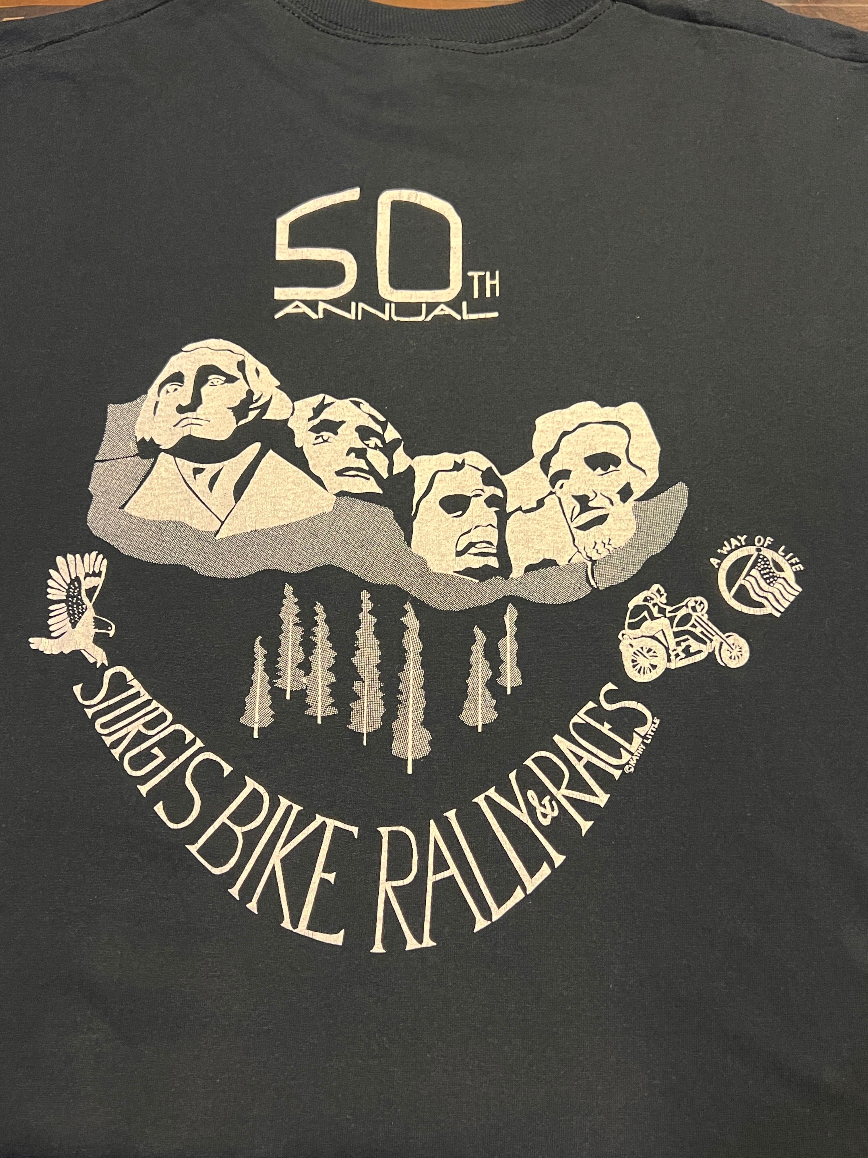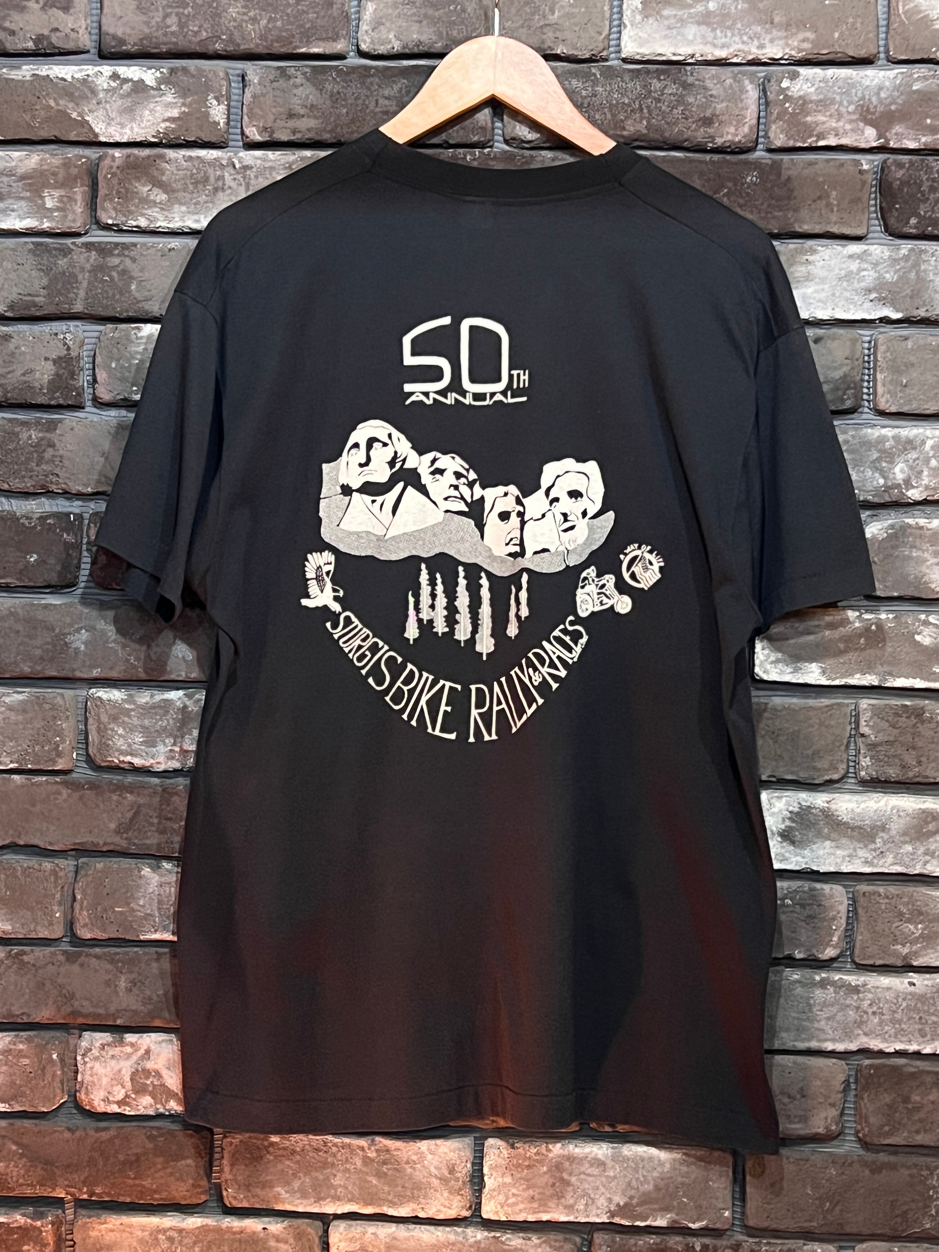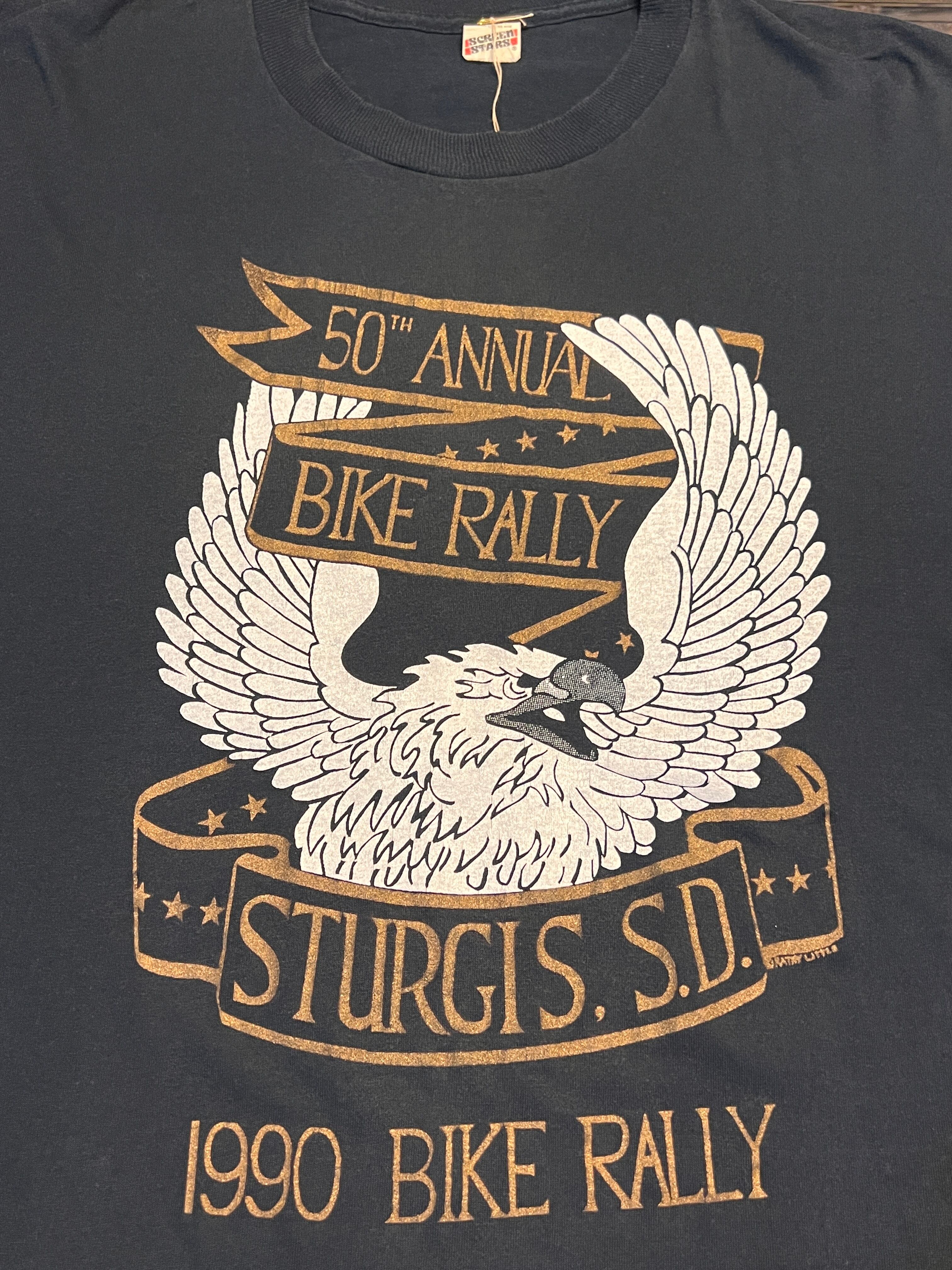 1990年、伝説のバイクイベント「STURGIS BIKE RALLY」50周年記念Tシャツ。フロントには翼を広げたイーグルと「STURGIS SD」のバナー、バックにはマウントラシュモアと共にSTURGIS BIKE RALLY and RACESのグラフィックが迫力満点でプリントされています。