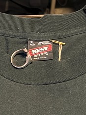 ボディはFRUIT OF THE LOOM社「BEST」タグ付き、USA製のポリコットンボディ(50% Cotton / 50% Polyester)。袖・裾ともにダブルステッチ仕様で90sらしいタフさと現代にもマッチするシルエットが魅力。生地もしっかりしており、古着として非常に良好な状態です。