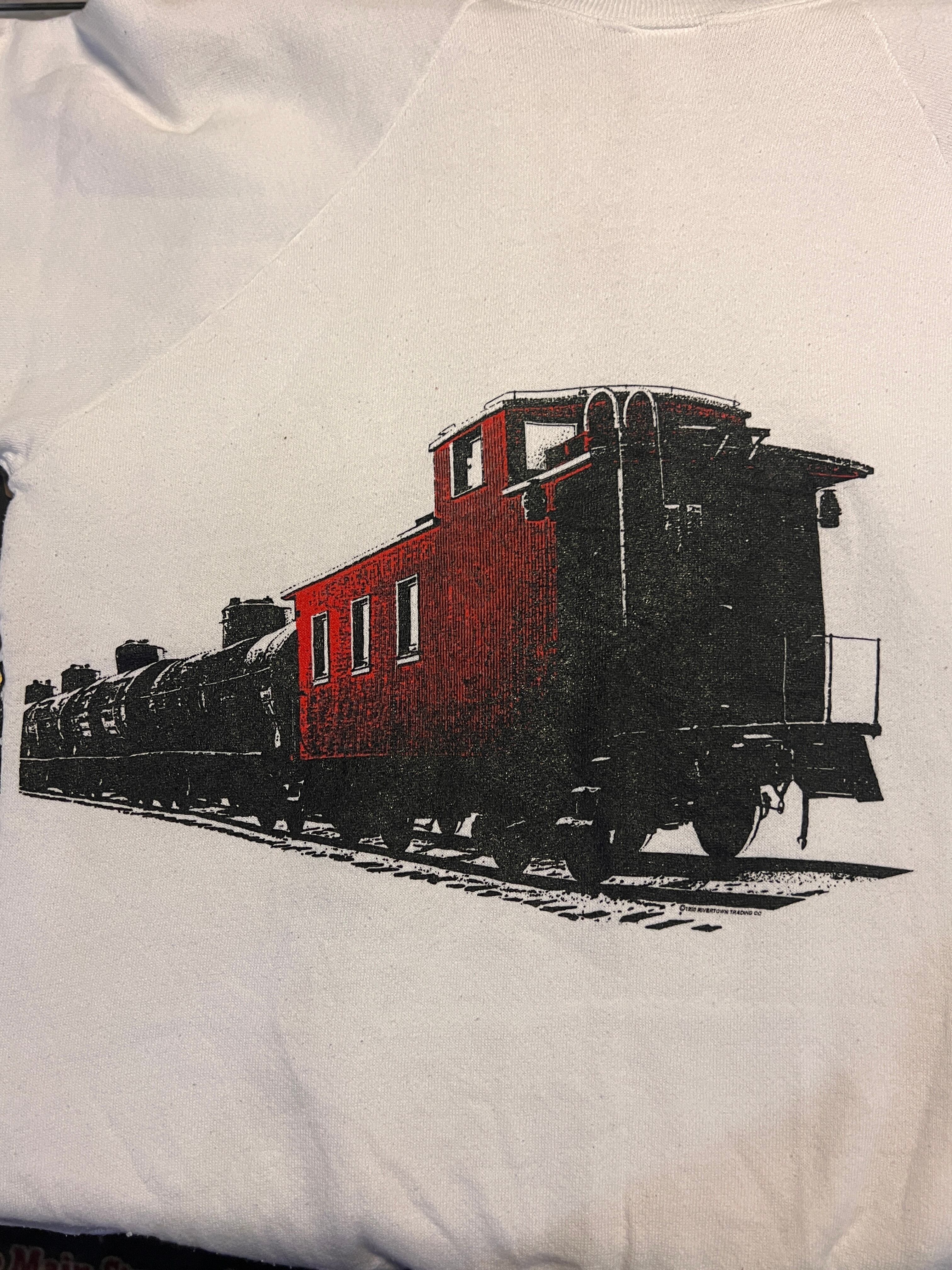 フロントには迫力ある蒸気機関車、バックには赤いカブース(車掌車)がプリントされた両面デザイン。鉄道モチーフ×ビンテージの組み合わせは希少性が高く、コレクション性抜群の一着です。