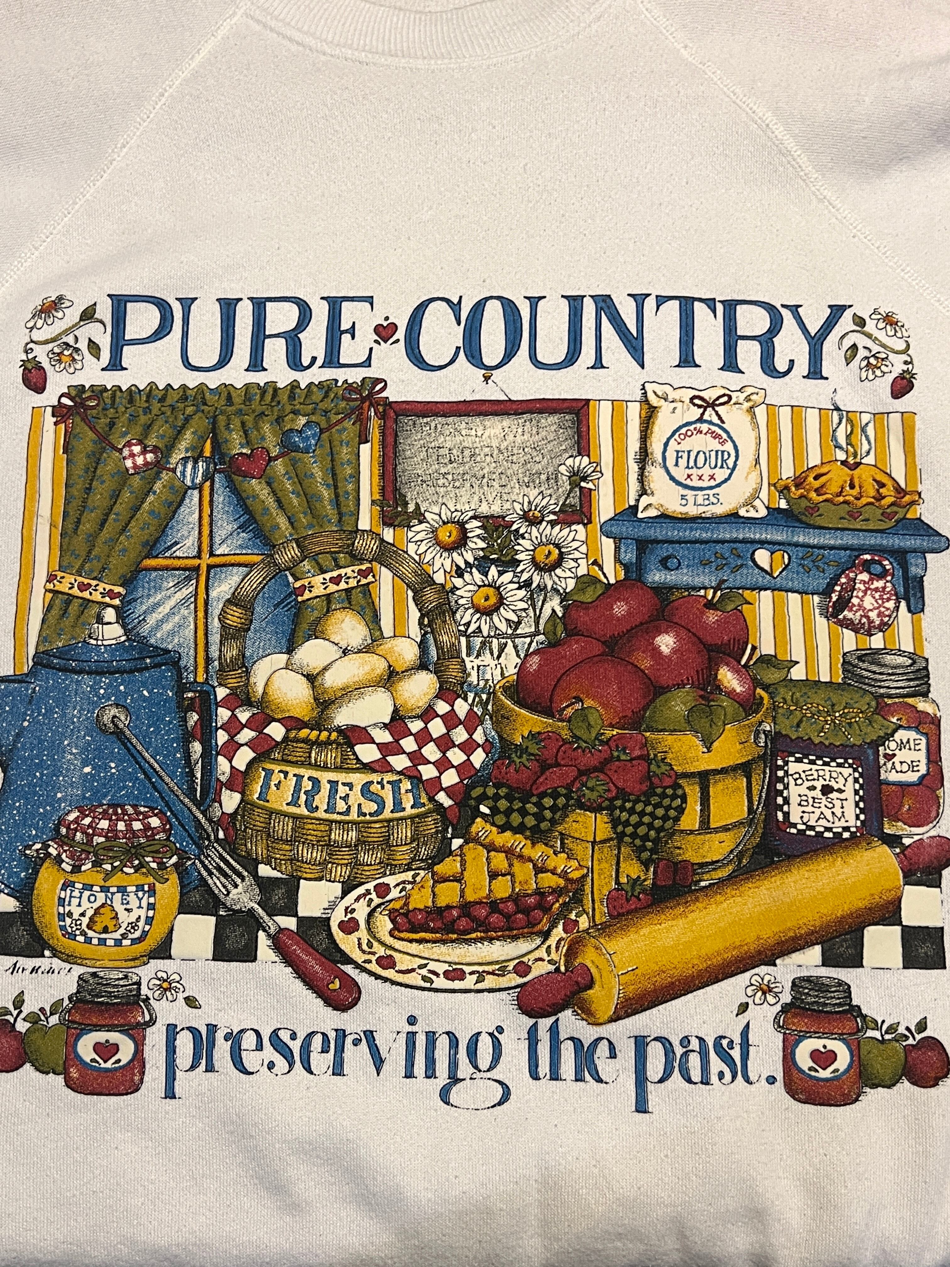 フロントには「PURE COUNTRY / preserving the past」と題された、カントリー調の静物画イラストが大きくプリントされた一枚。フルーツや花、アップルパイなど、アメリカらしいノスタルジックな雰囲気を感じさせます。