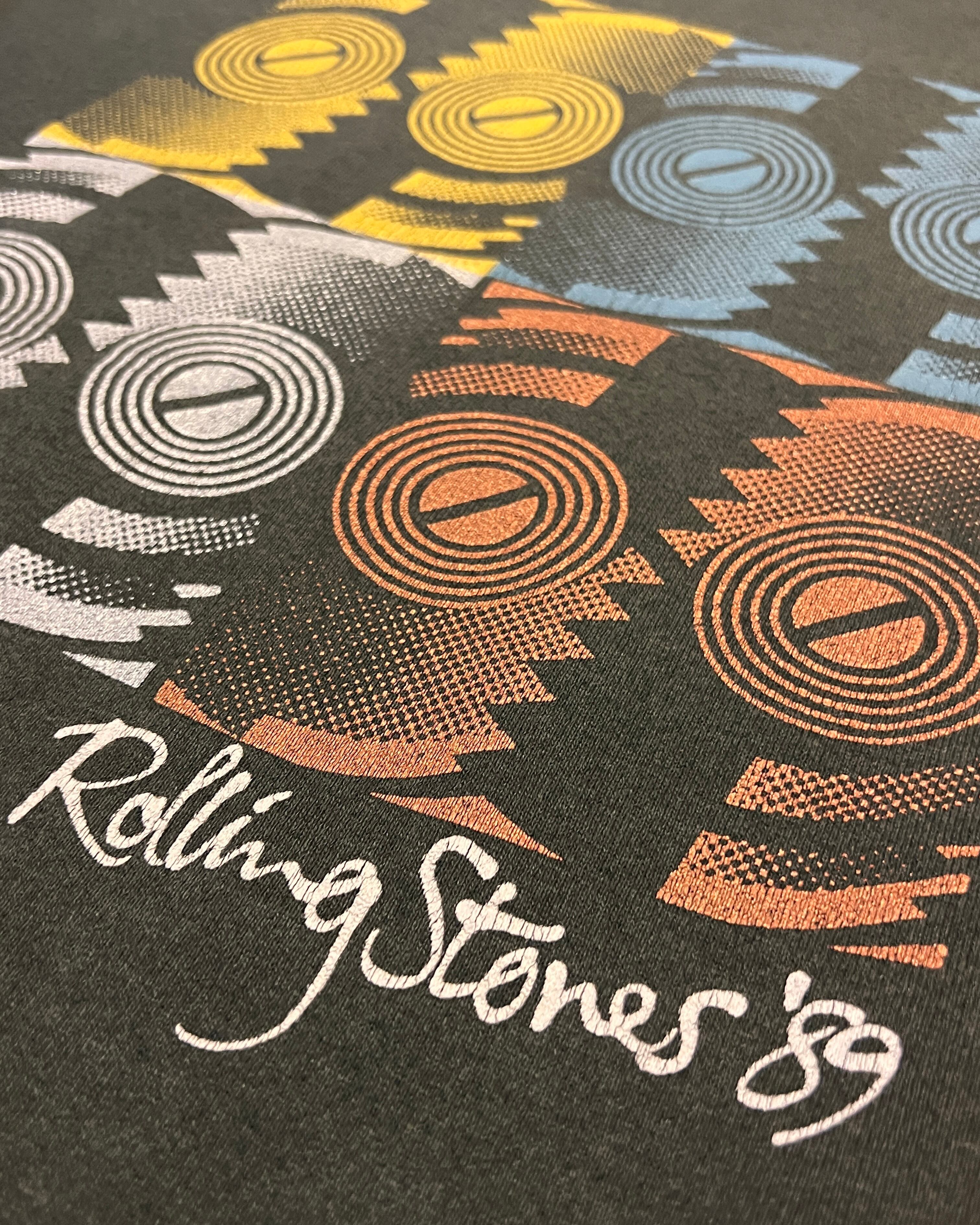 フロントは大胆なレコードモチーフのポップアート風デザイン、バックには名盤期を象徴するTongue and Lipsロゴとツアー表記が入るスペシャルな一着。