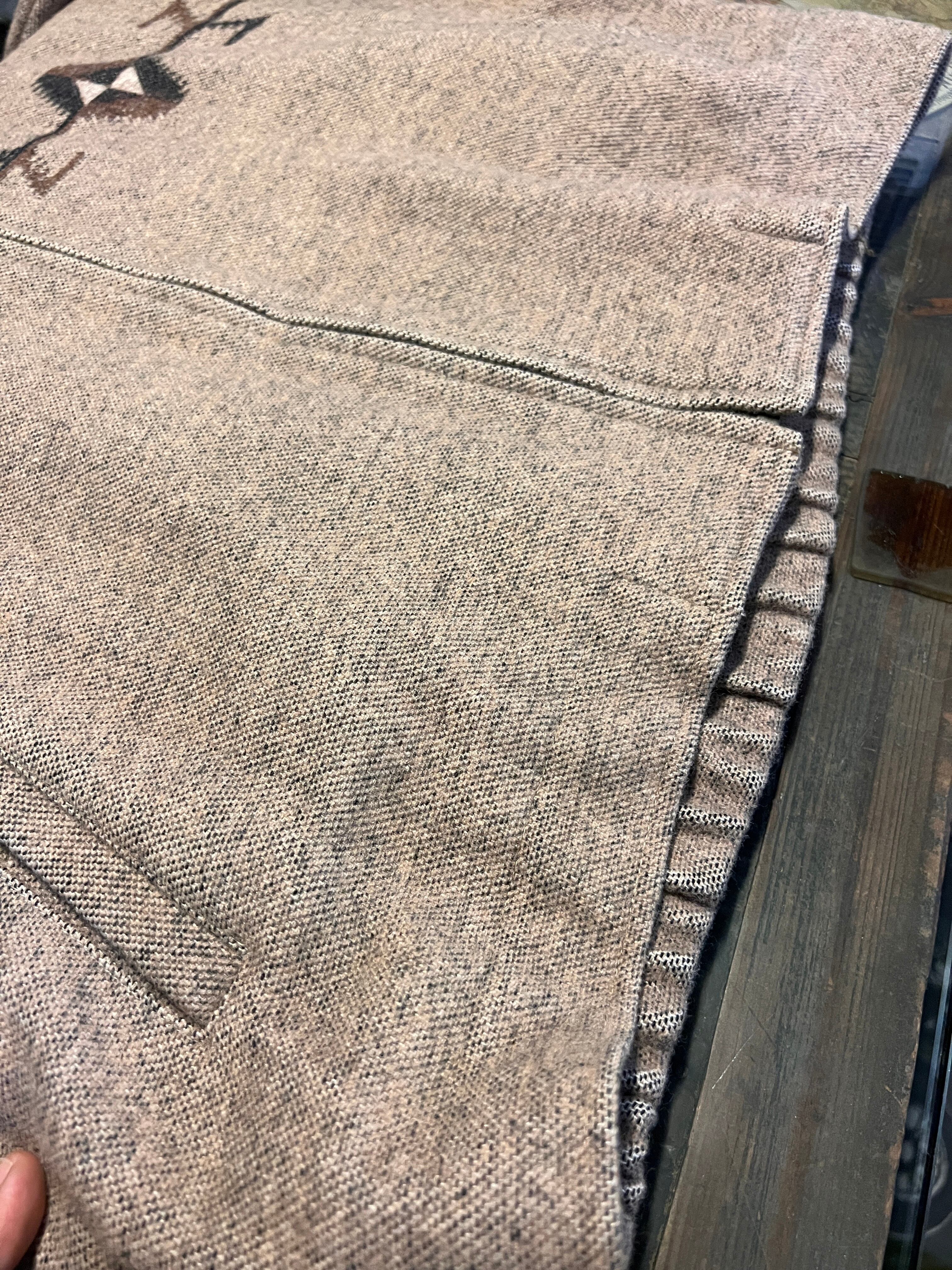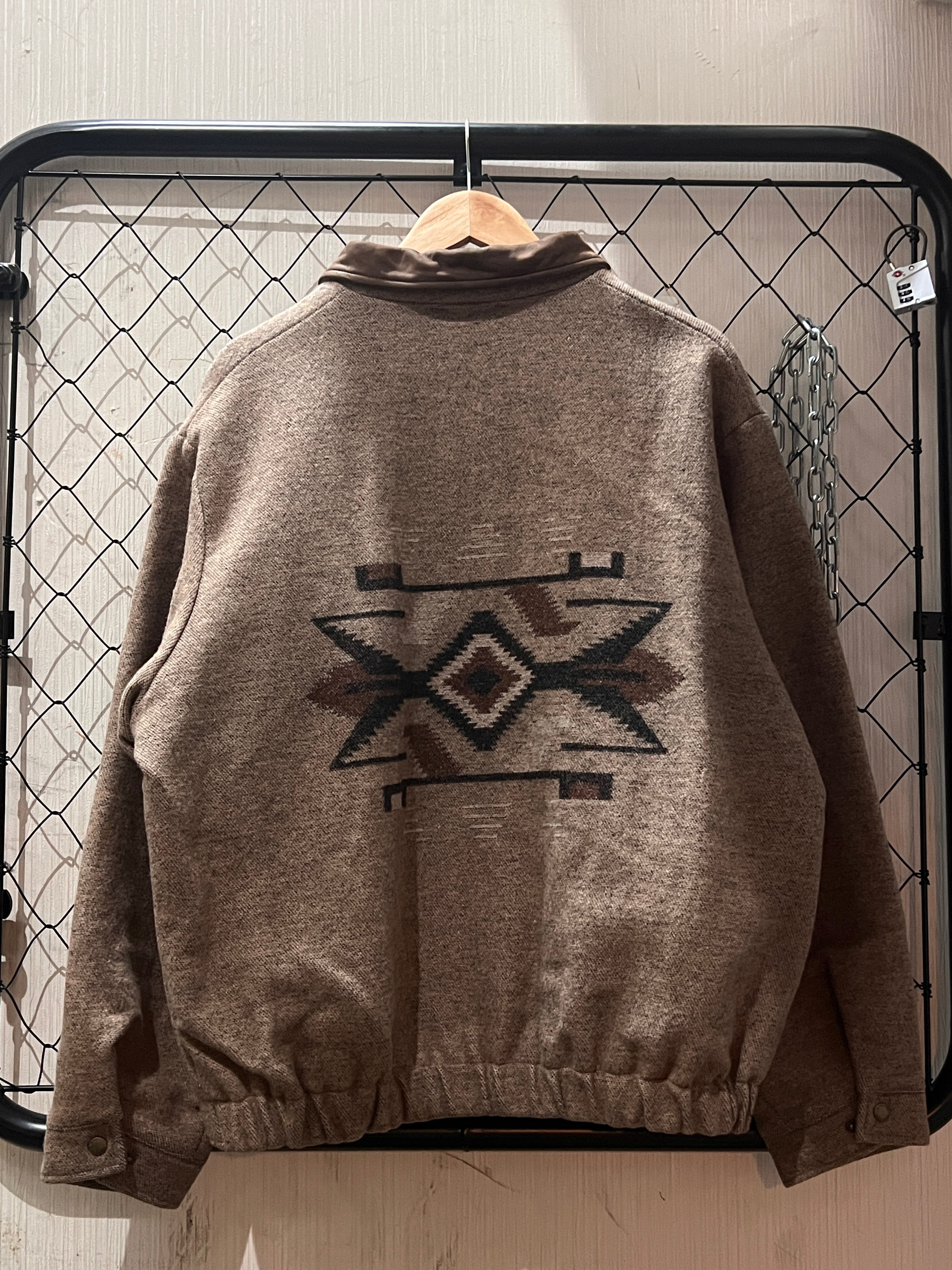 ネイティブ柄をモチーフにした幾何学デザインがフロント・バックに織り込まれ、ブラウンスエードの襟が上品なアクセント。