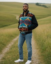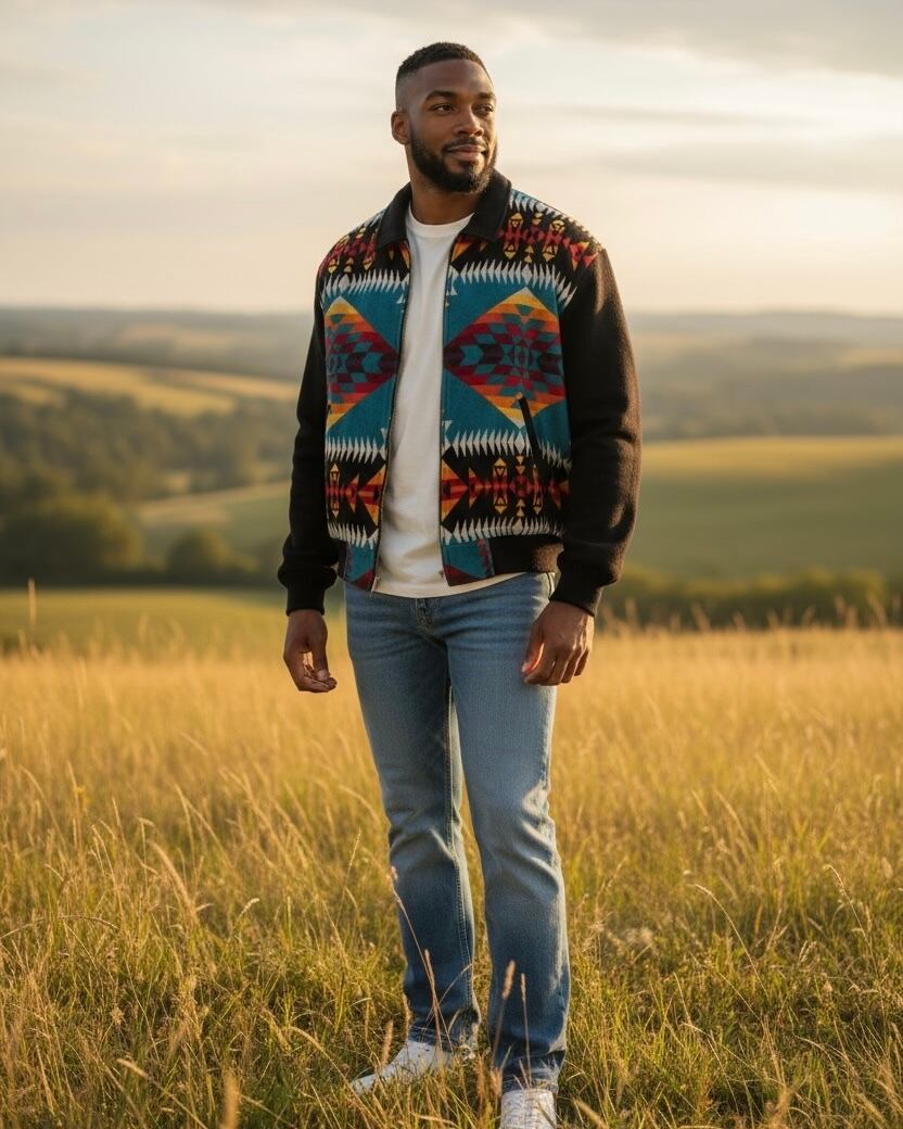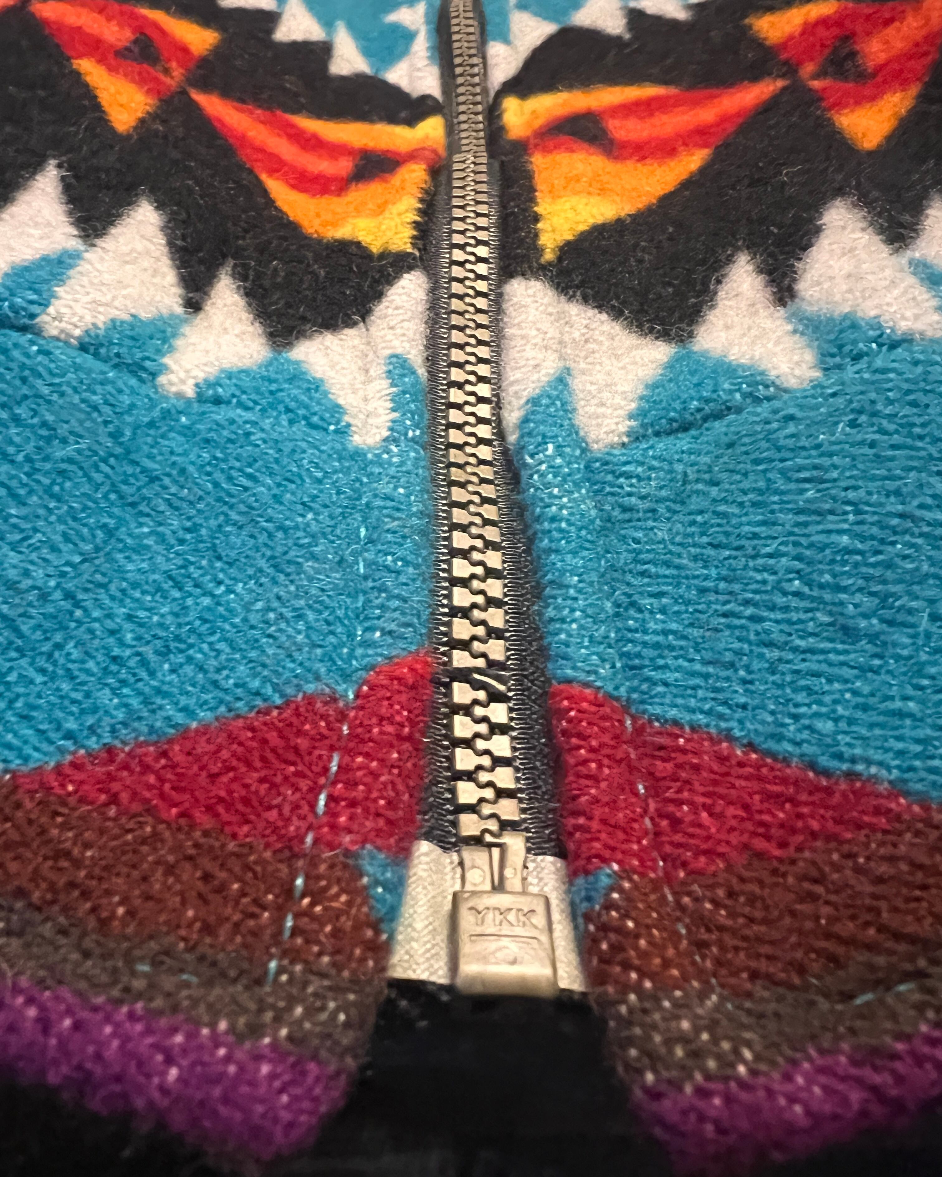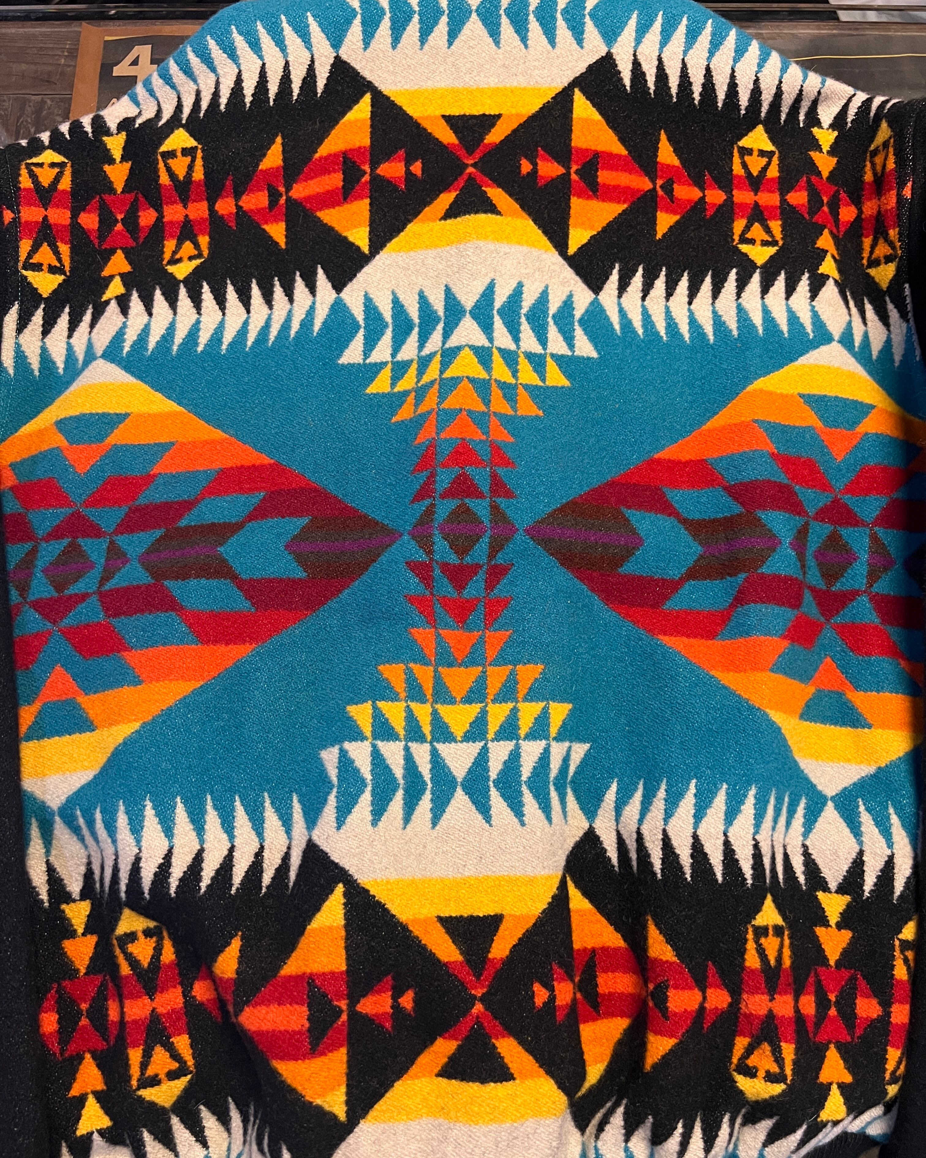 ターコイズを基調とした大胆なネイティブ柄が全面に織り込まれた、アートピースのようなウールジャケット。