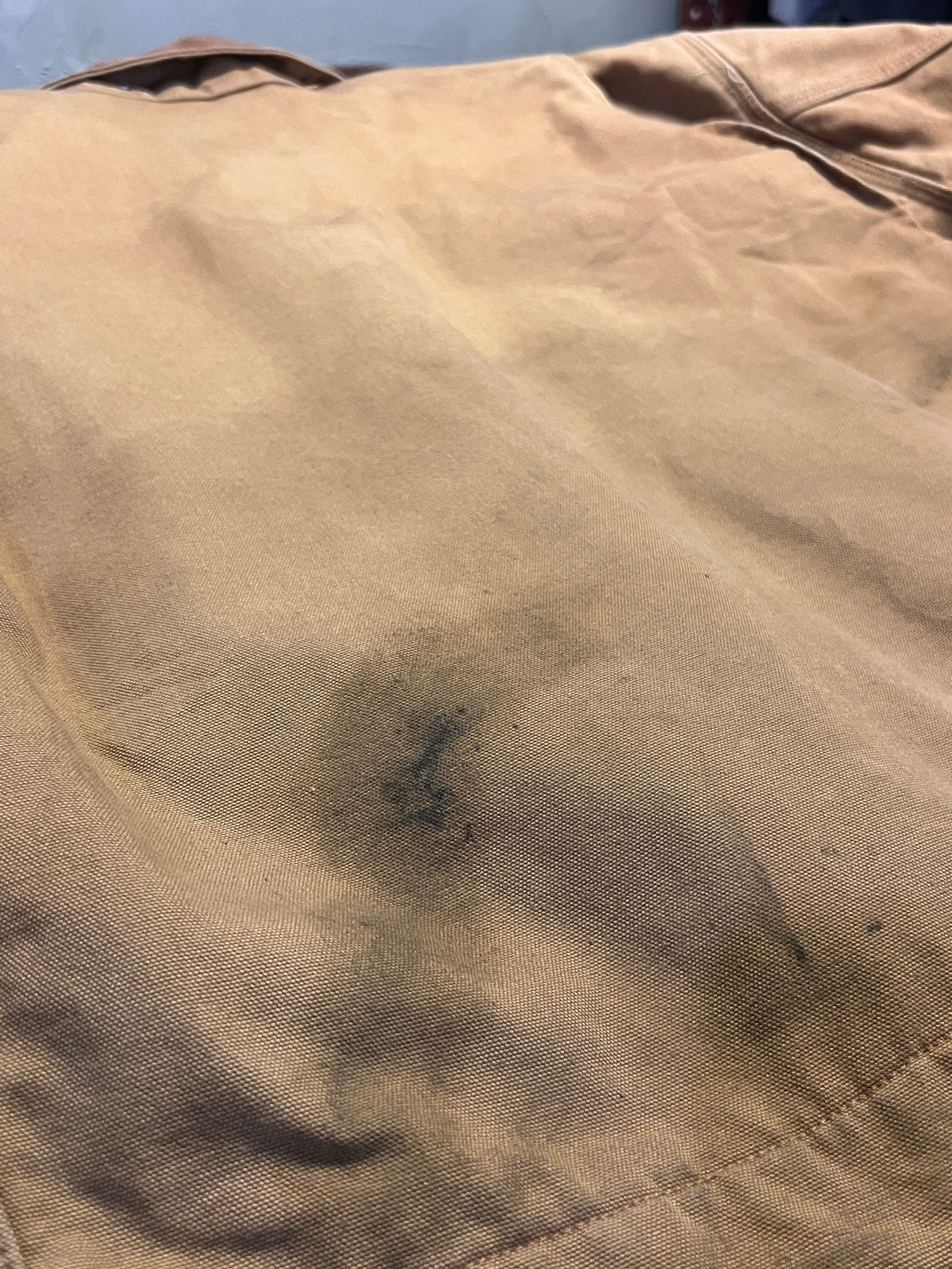 しっかり使い込まれた1着で、背面や袖にオイル汚れ・黒ずみが残るリアルワーカー物。