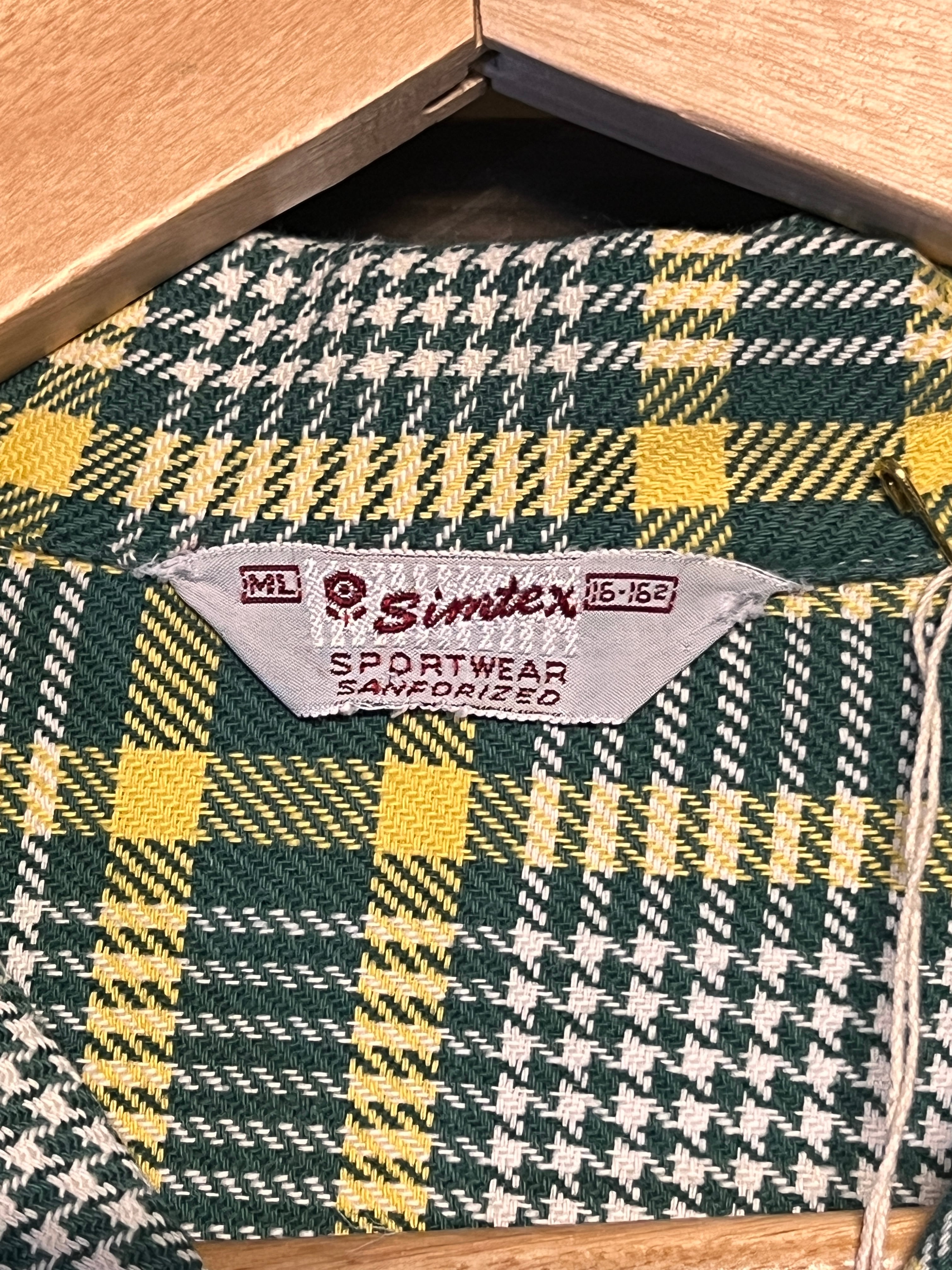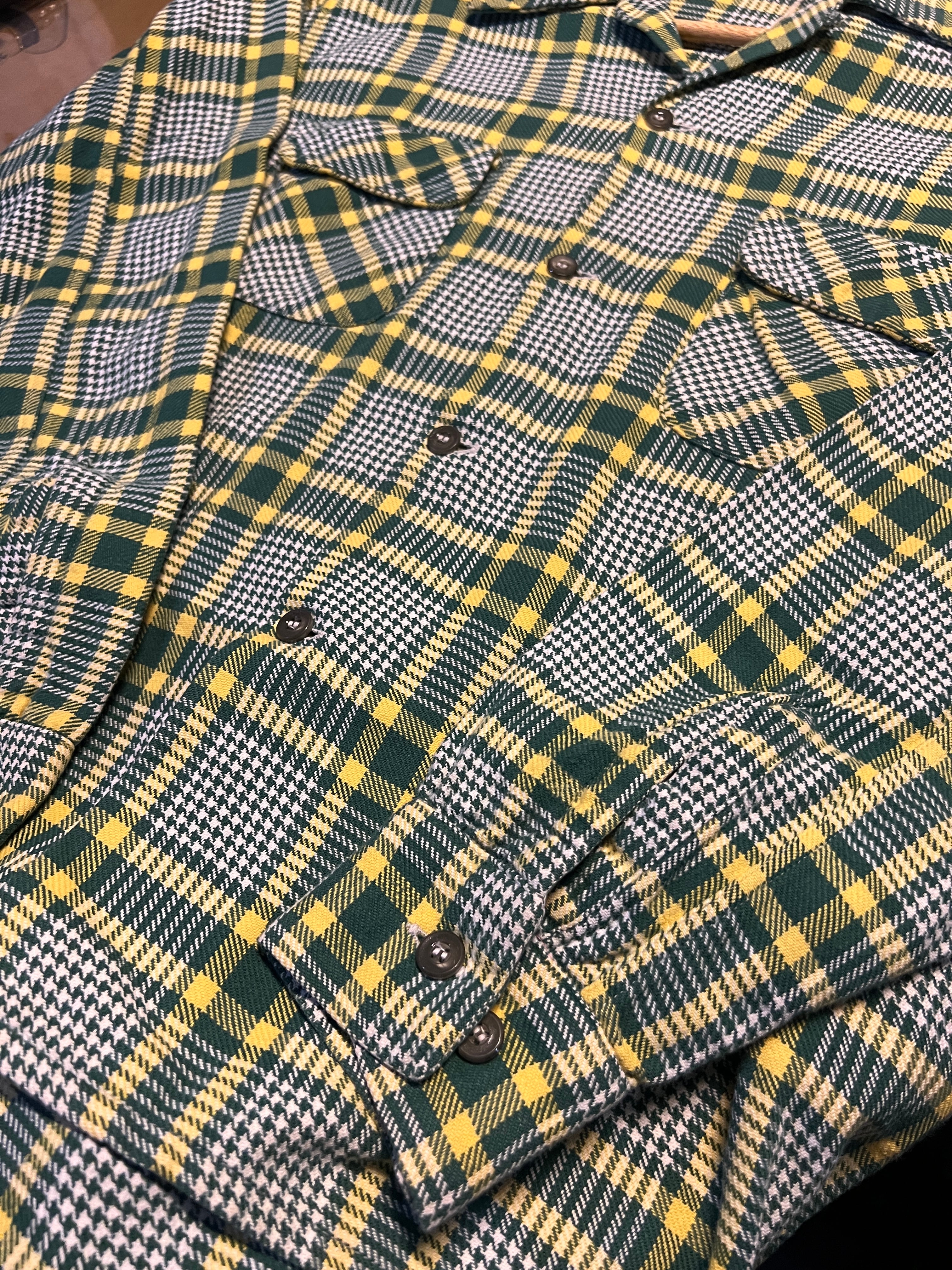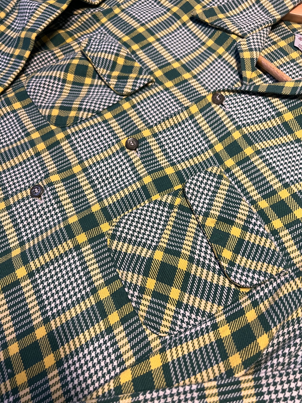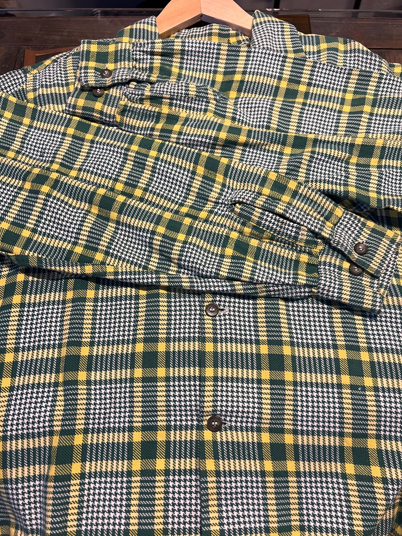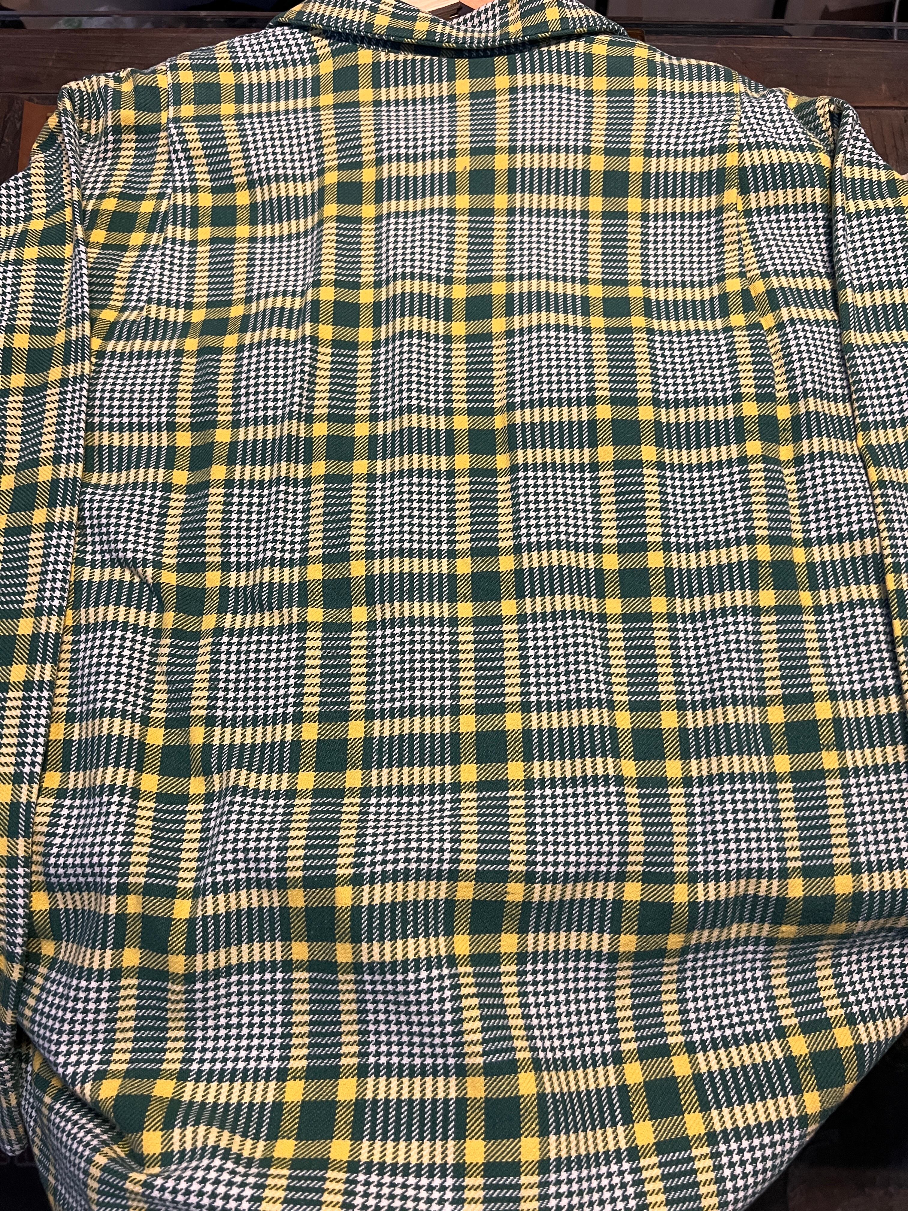 グリーン×イエローを基調としたクラシックなチェックパターンに、細かいハウンドトゥース調の織りが組み合わさった、ヴィンテージらしい非常に雰囲気の良い一枚です。