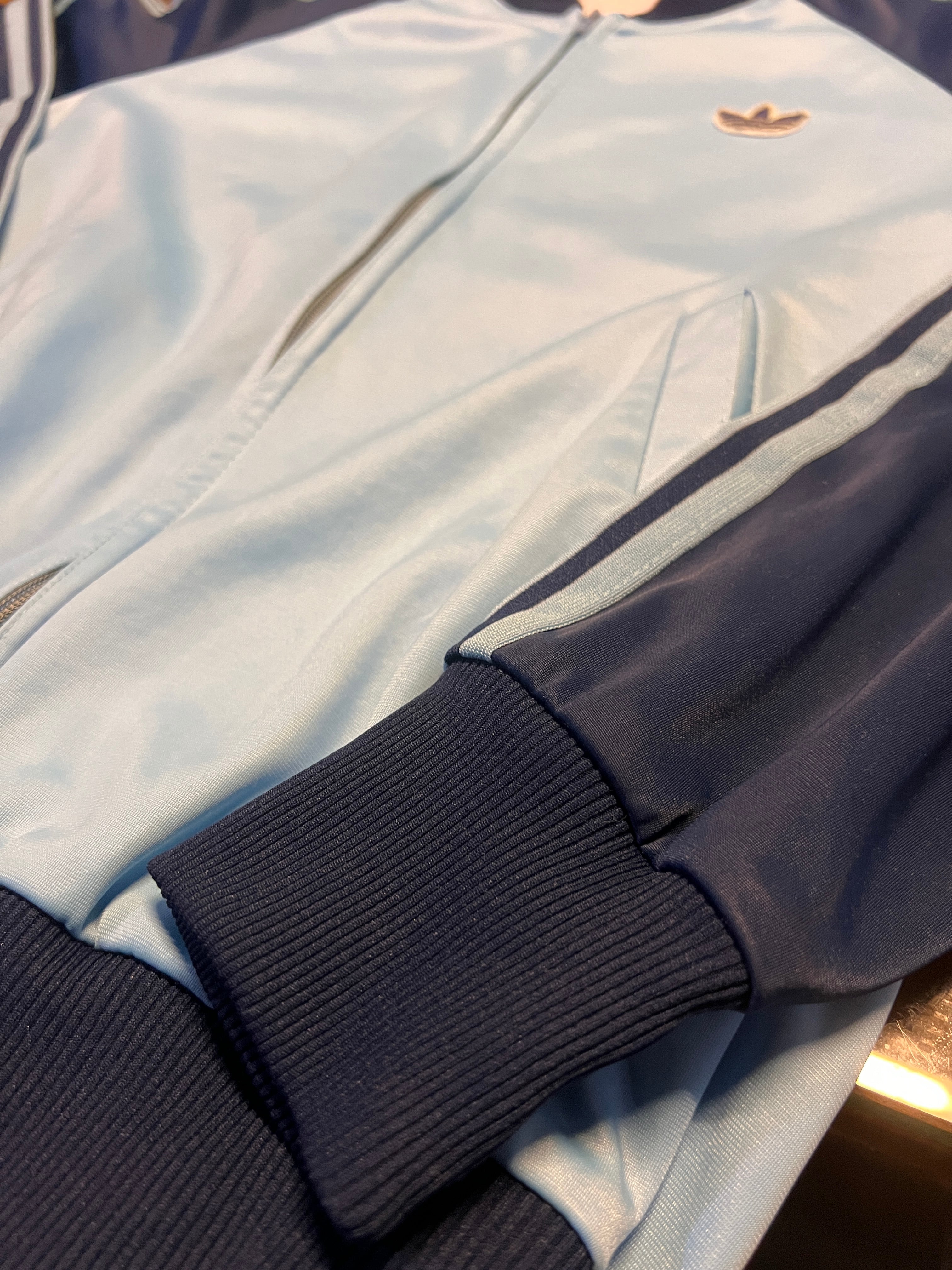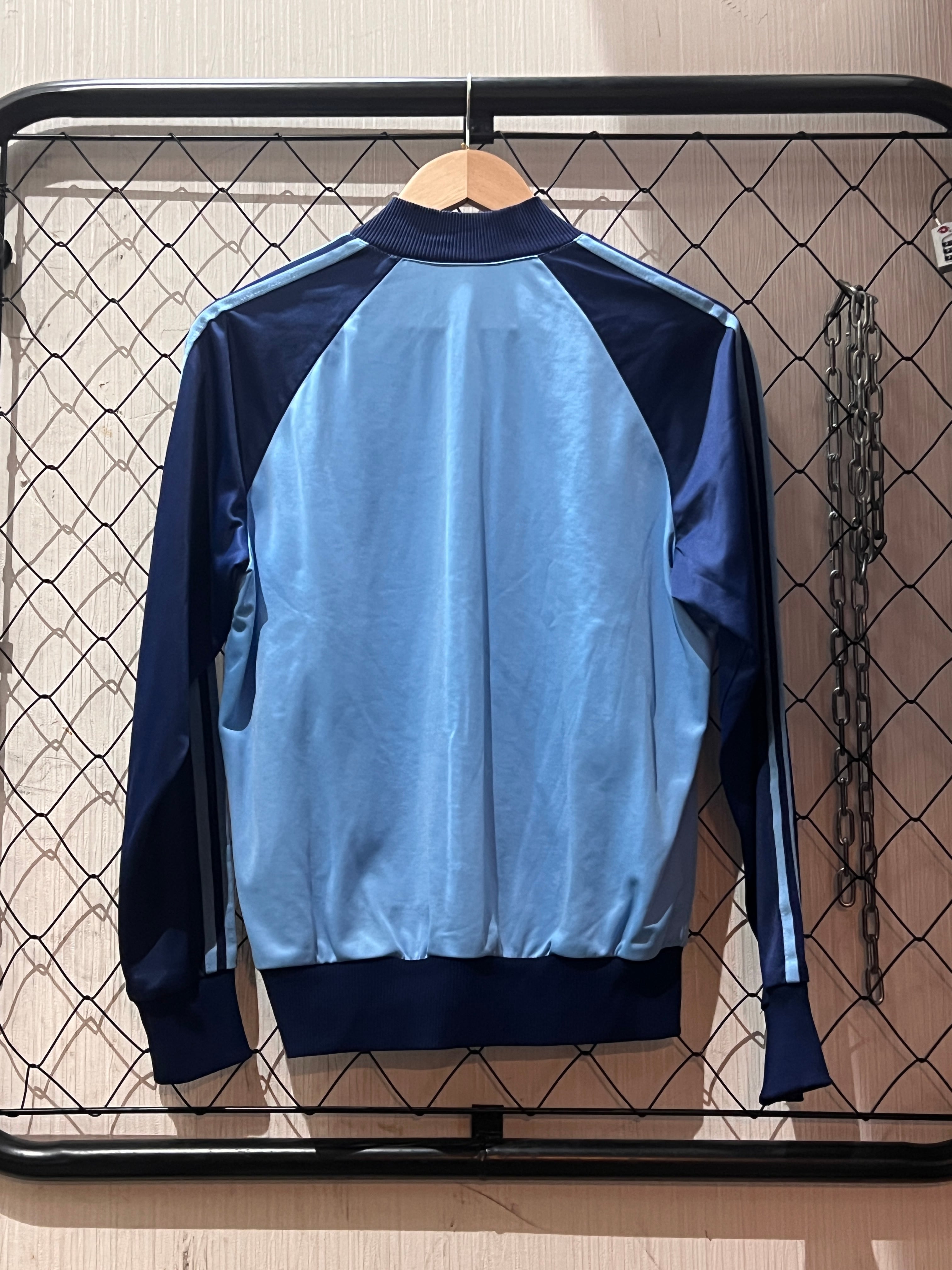 数あるアディダスのトラックジャケットの中でも、高い人気を誇るスカイブルー×ネイビーのバイカラーモデルが入荷しました。