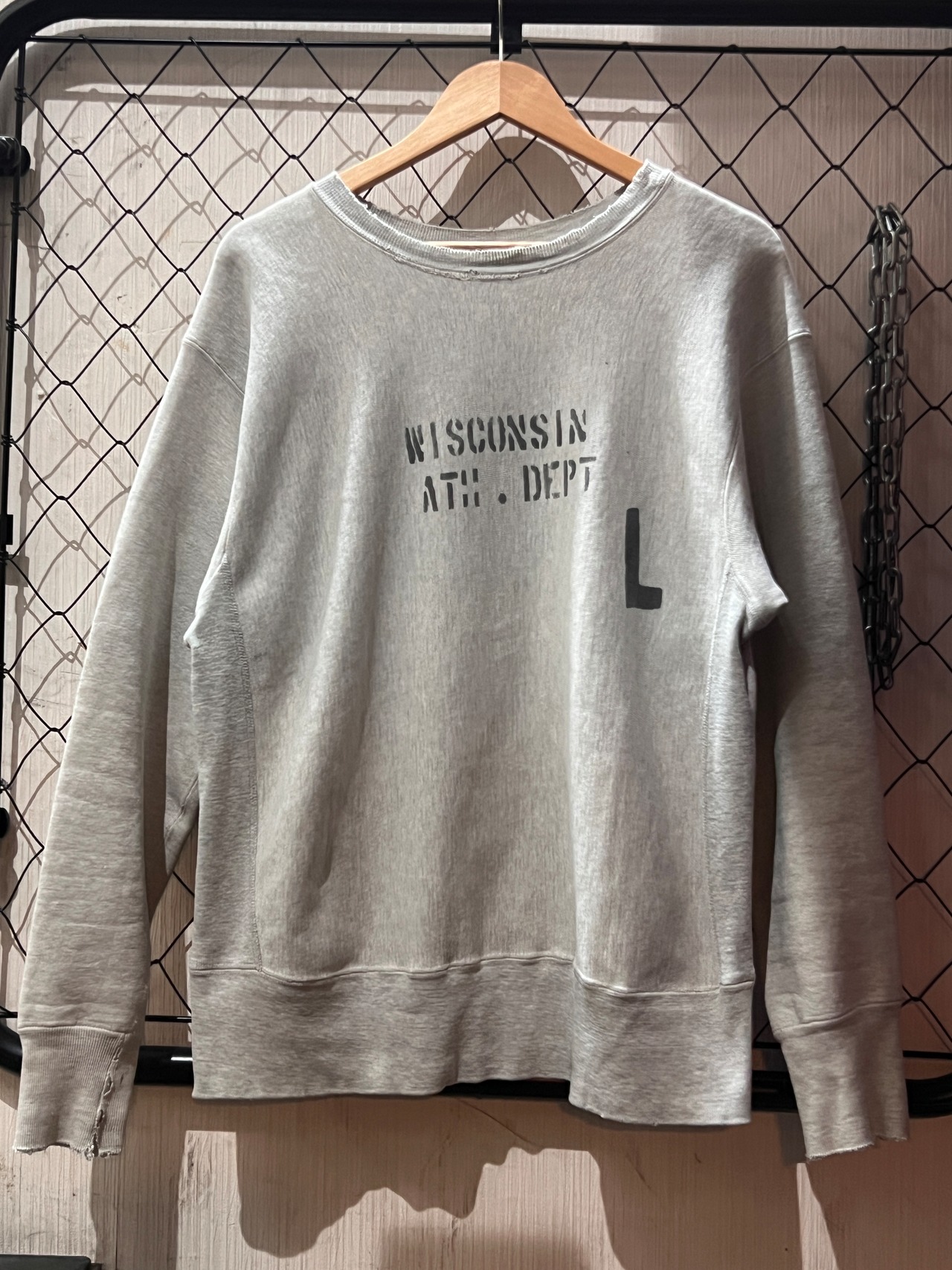 最大の魅力は、フロントに施された「WISCONSIN ATH. DEPT」のステンシルプリント。
