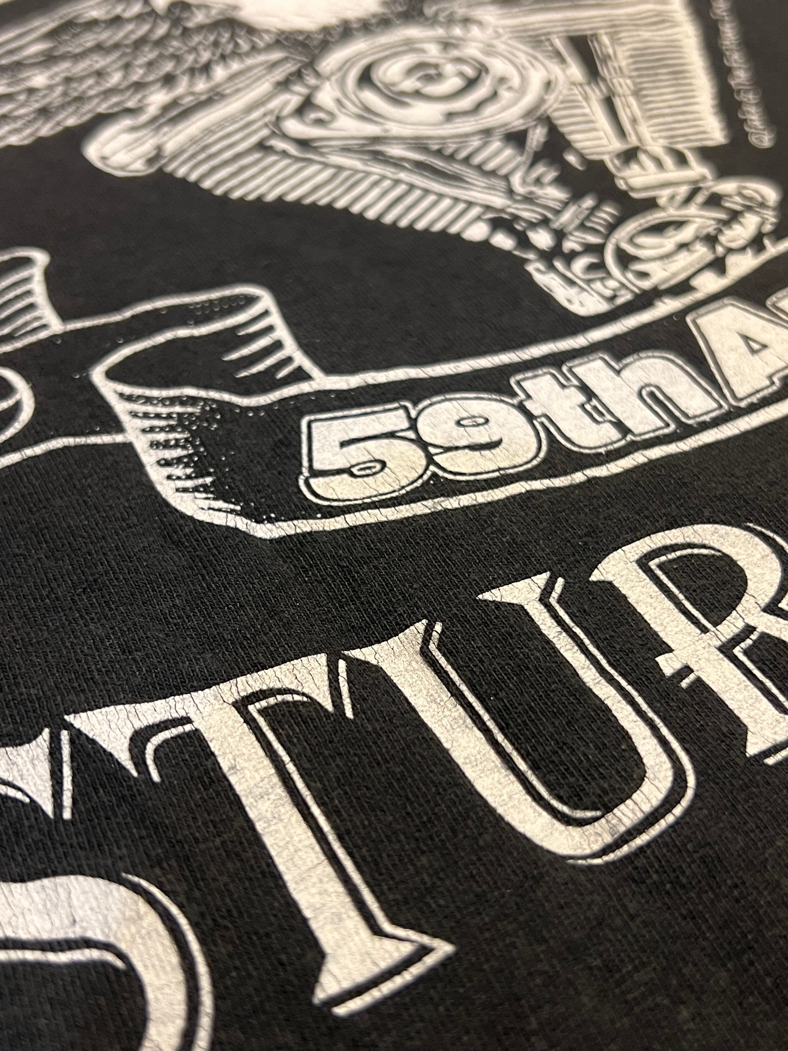 バイカーTの中でも人気の高いSTURGISのアニバーサリー物で、年代・デザインともに評価の高い一着です。