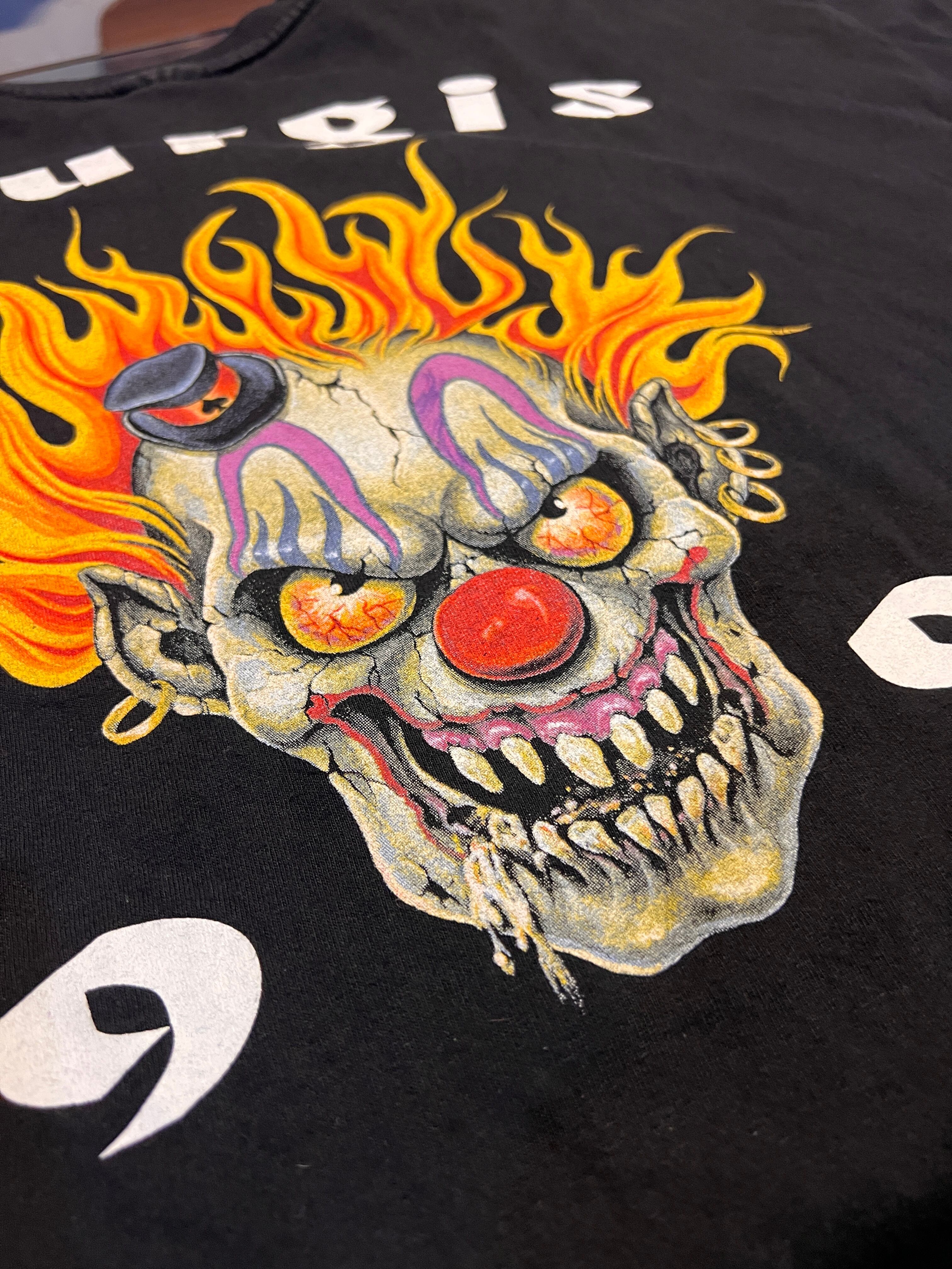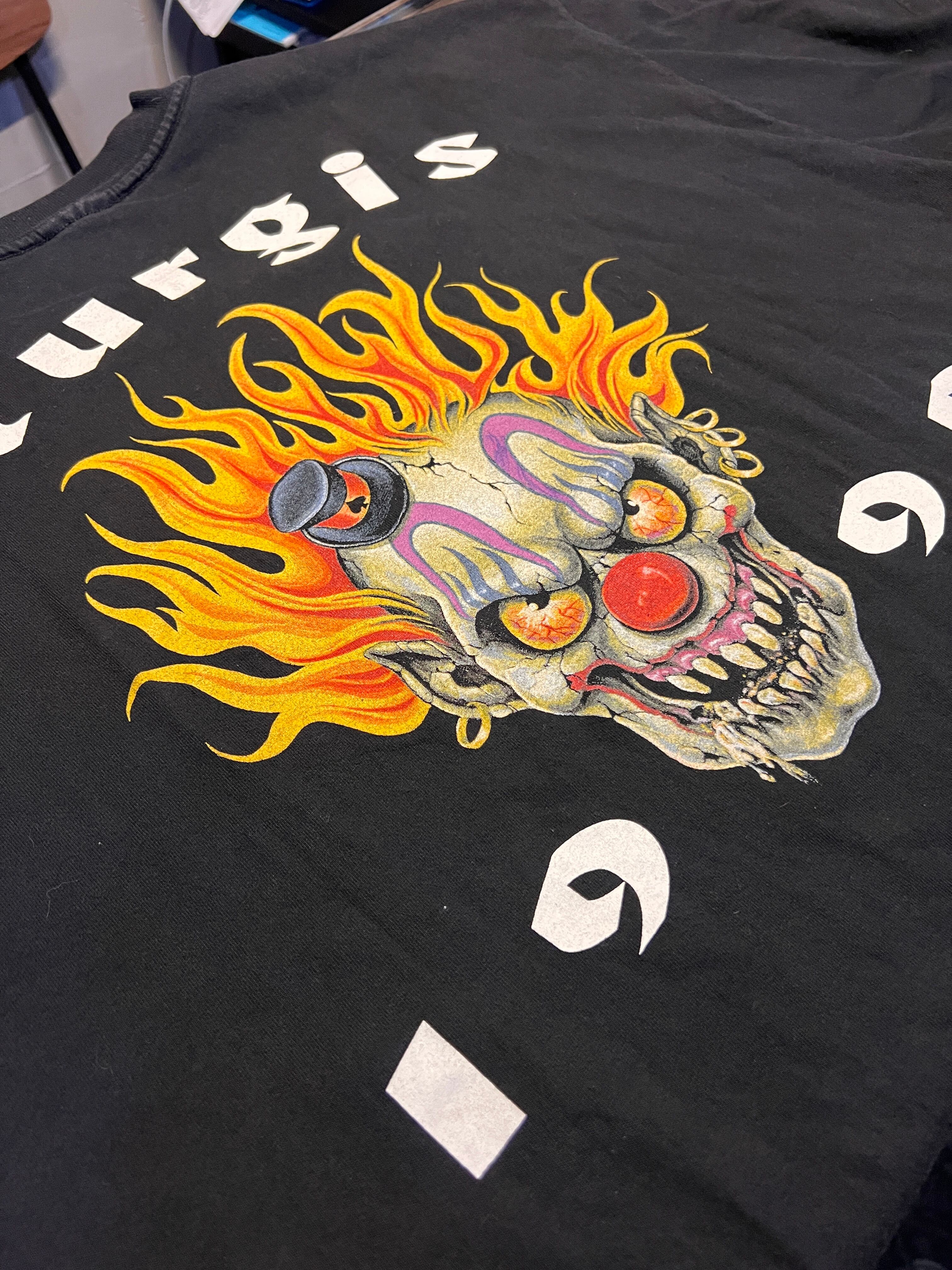 フロントはシンプルなロゴ、バックにはフレイムとスカルを組み合わせたインパクトのあるグラフィックが入る一着です。