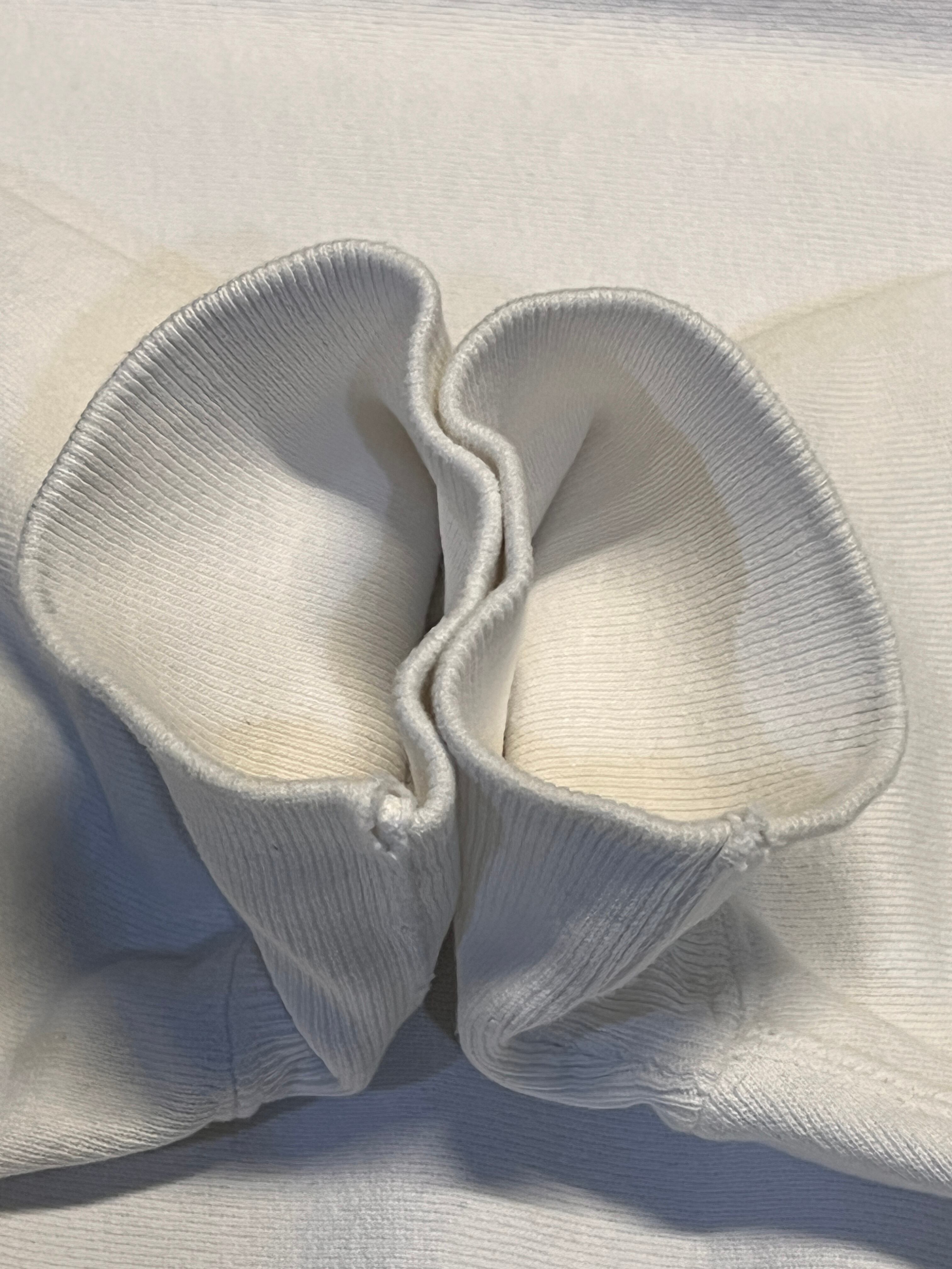 ボディはホワイトカラーで、リバースウィーブ特有のしっかりとした肉厚な生地感と横使いの仕様により、型崩れしにくく長く着用いただけます。1枚でもインナーでも使いやすく、スタイルを選ばない万能な一着です。