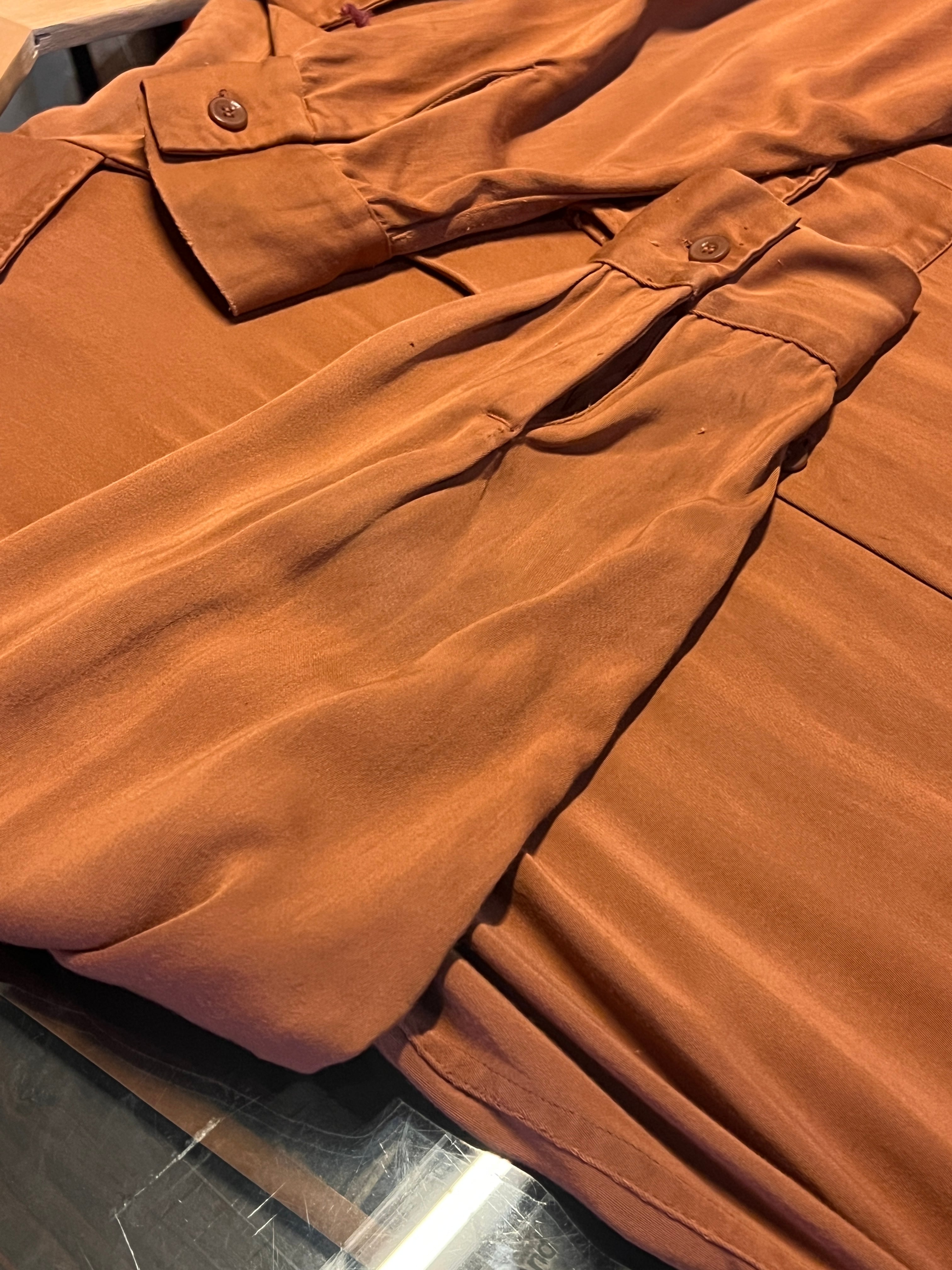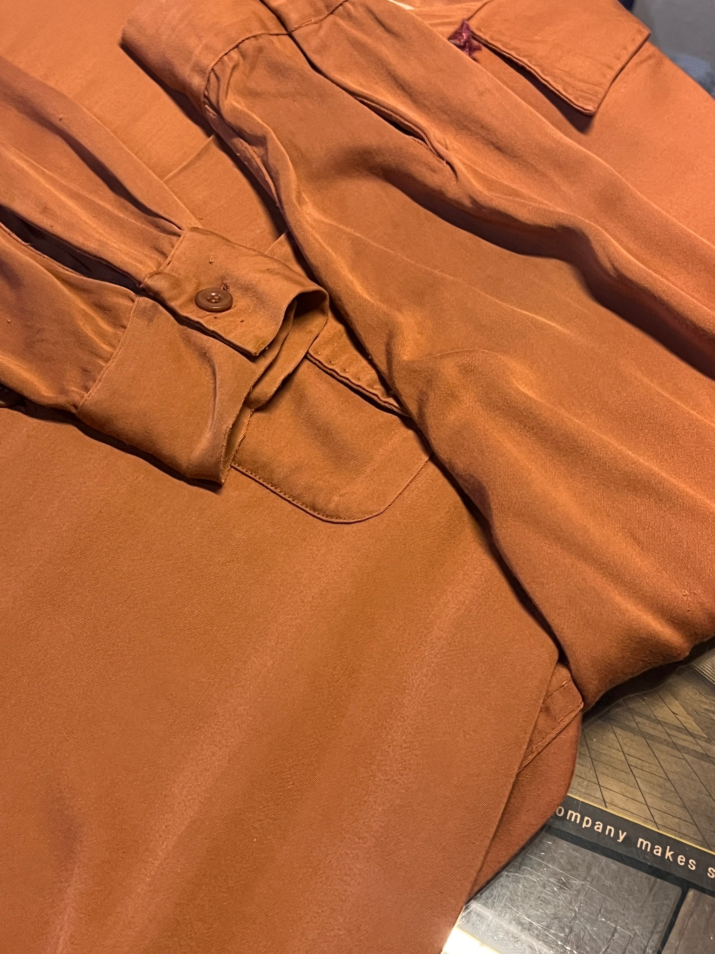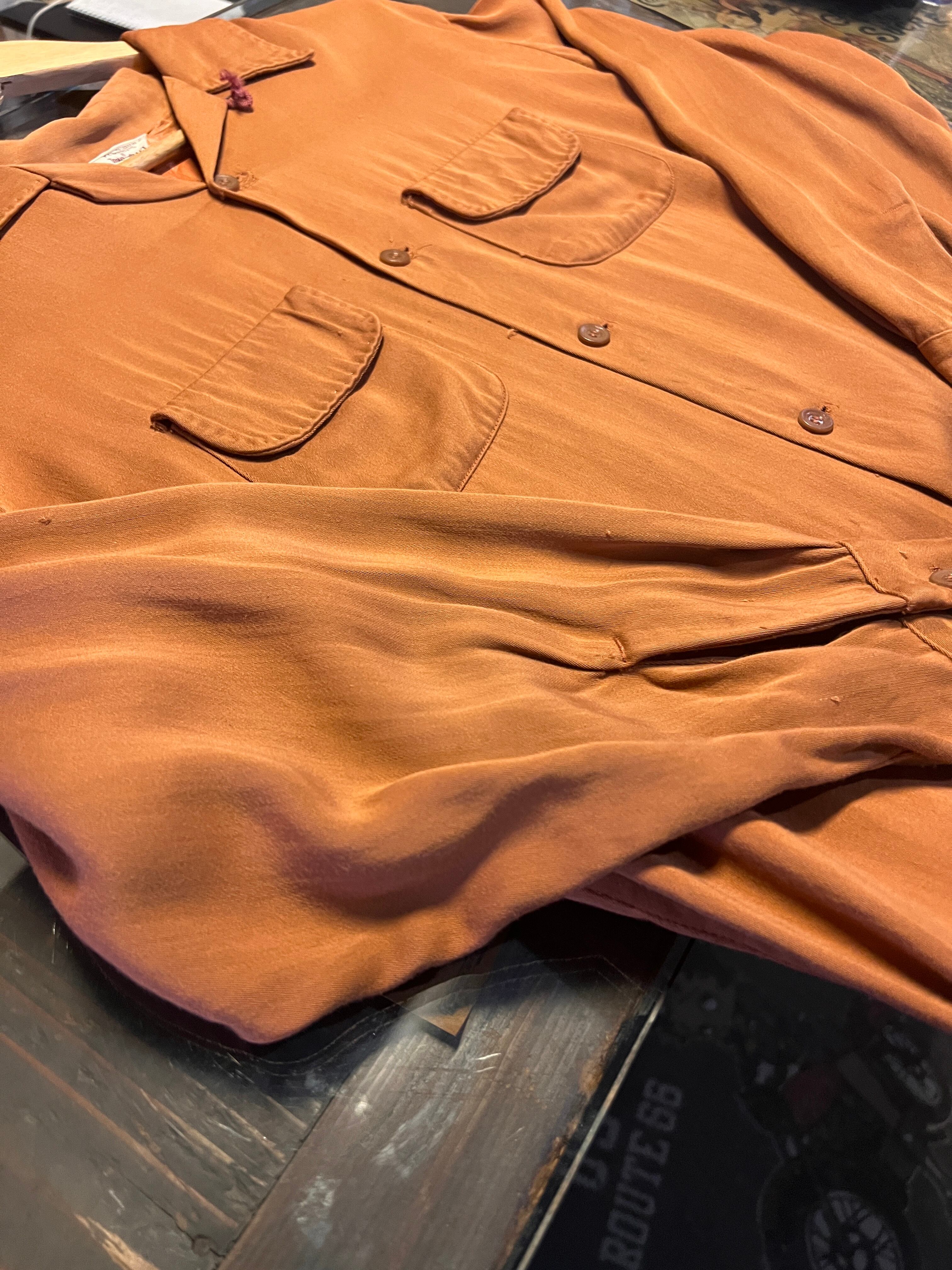 当時らしい滑らかなレーヨン生地によるドレープ感と、開襟仕様のリラックスしたシルエットが特徴的な1着。フラップ付きのダブルポケット仕様もポイントです。